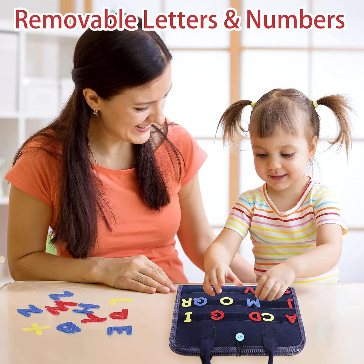 • Des chiffres et lettres (A-Z, 0-9) en Velcro pour initier votre enfant à la reconnaissance des formes, des couleurs et des premières notions éducatives.