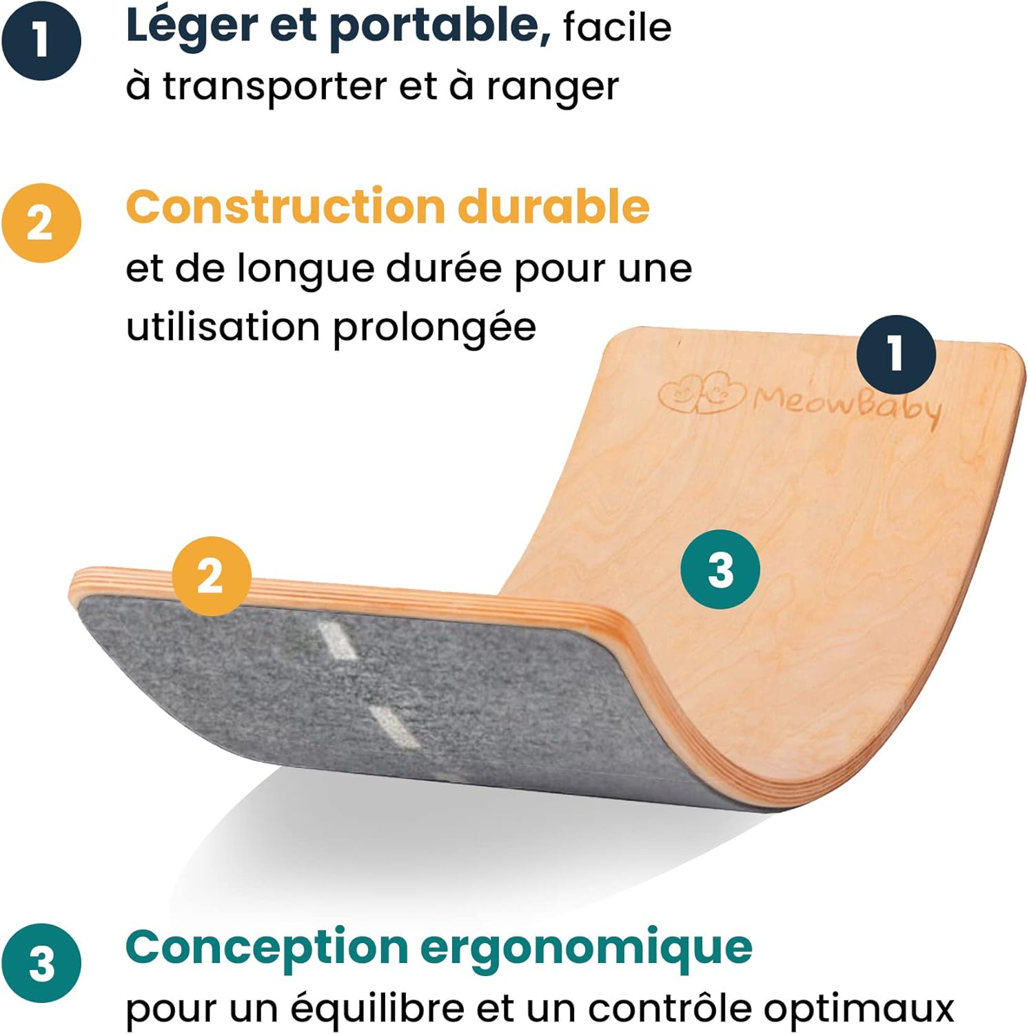 Découvrez la planche d’équilibre Montessori Meowbaby, en bois robuste de 80x30cm, idéale pour développer l’équilibre, la coordination, la confiance et l’indépendance des enfants à partir de 3 ans, tout en favorisant un jeu actif.