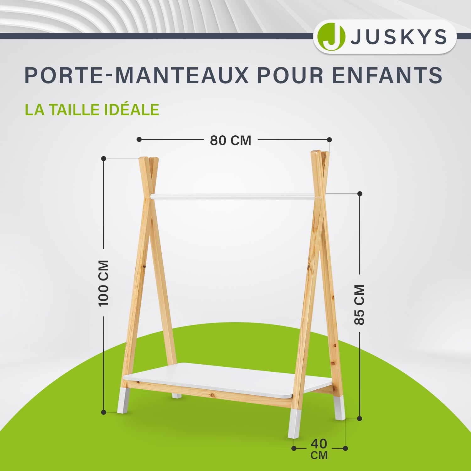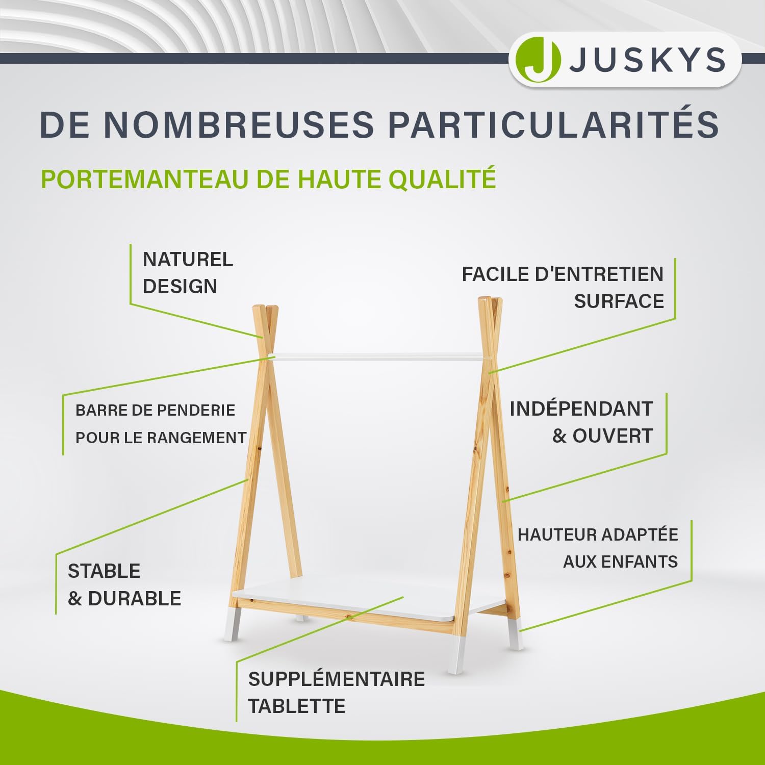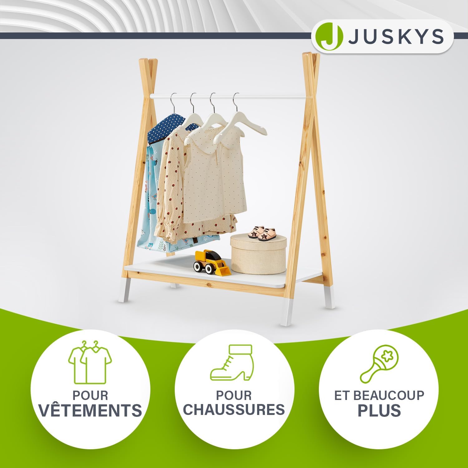 Ce porte-manteau ne se contente pas d’accueillir des vêtements sur sa tringle, il dispose également d’une tablette inférieure pratique. Ce compartiment supplémentaire est idéal pour ranger des chaussures, des sacs ou encore des boîtes de rangement contenant des jouets ou accessoires. Tout reste ainsi à portée de main pour votre enfant, favorisant une gestion autonome de son espace personnel.