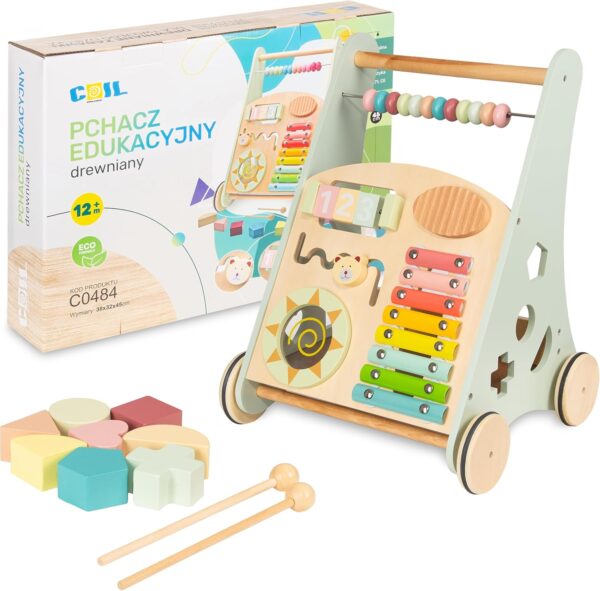 Bien plus qu’une simple poussette, ce chariot en bois est un véritable centre d’activités éducatives. Doté de nombreux jeux colorés et interactifs, il stimule les capacités cognitives, la coordination main-œil et l’imagination des tout-petits. Parmi ses fonctionnalités, on retrouve :