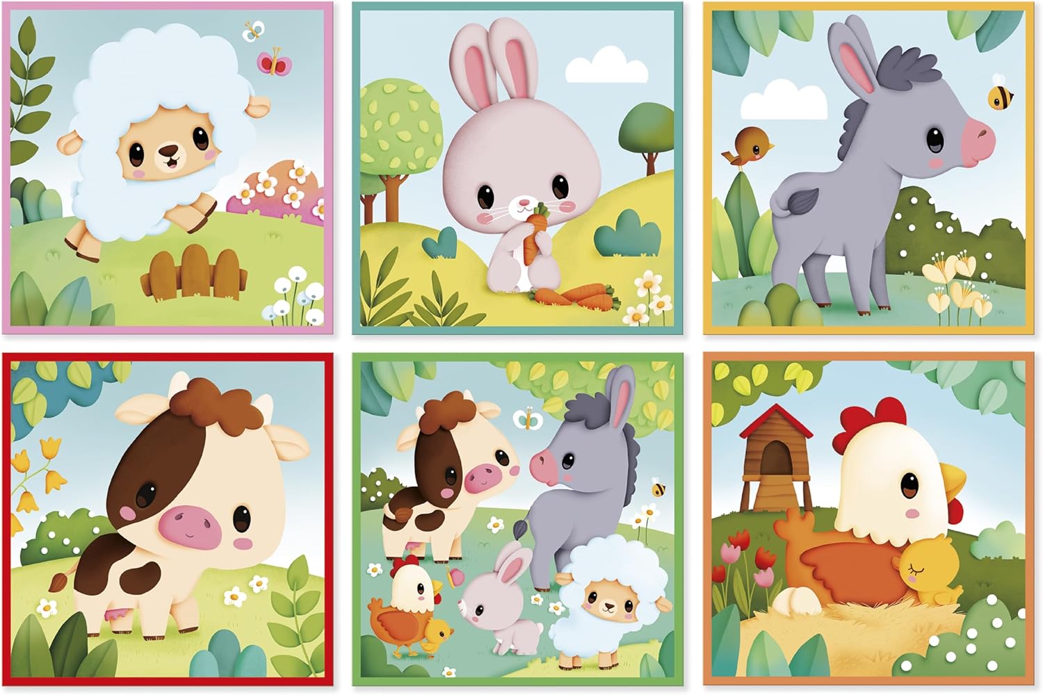 Avec ce jeu, votre enfant pourra reconstituer six illustrations uniques mettant en scène les animaux emblématiques de la ferme. Chaque face des cubes représente un animal différent : un mouton doux, un lapin espiègle, un âne amical, une vache paisible, une poule attentive et une scène collective rassemblant tous ces compagnons de la ferme. Ces images colorées et mignonnes captiveront l’attention de votre enfant, tout en lui apprenant à reconnaître les animaux et à associer les formes.