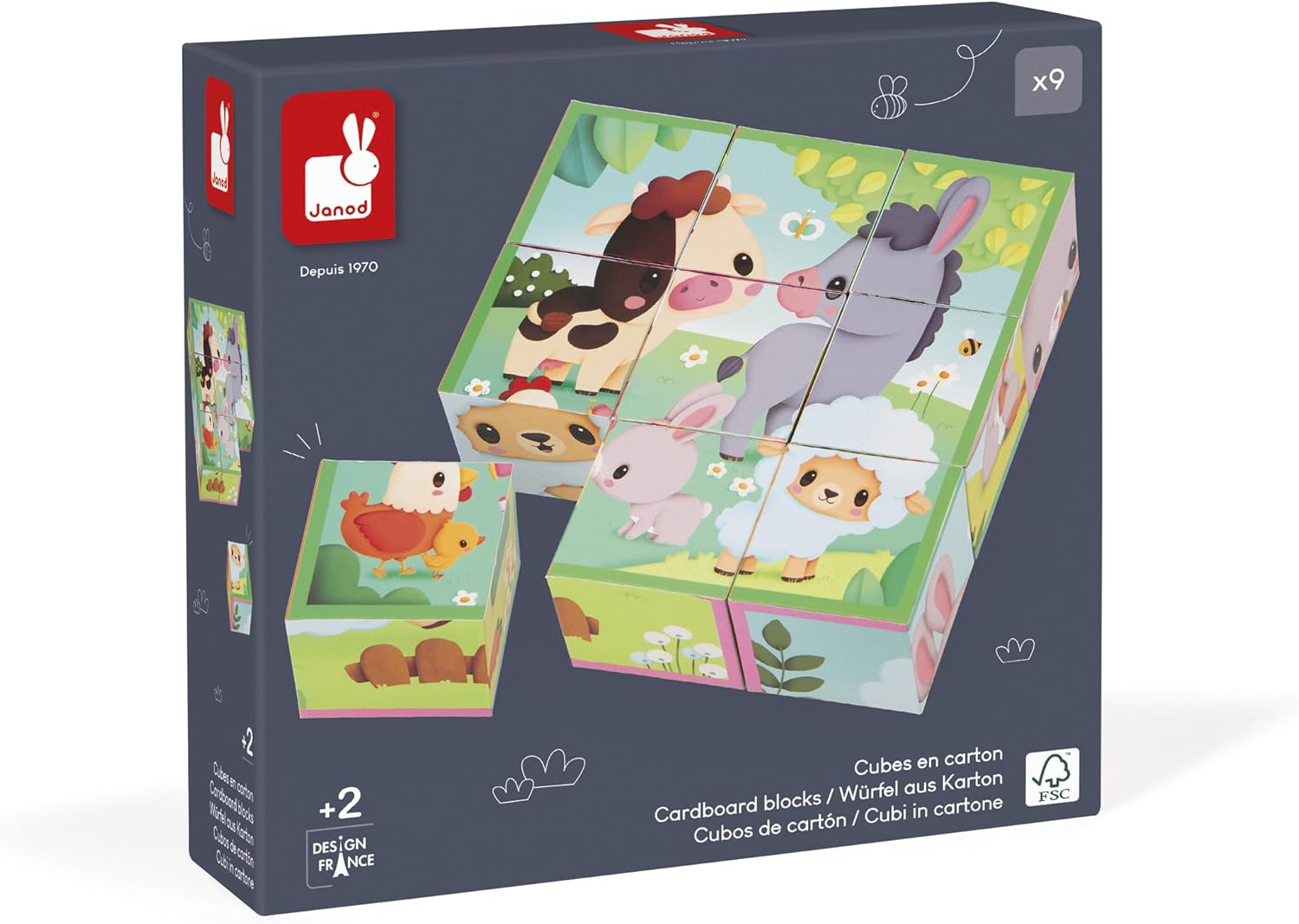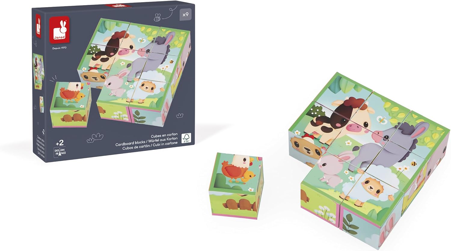 Stimulez l’éveil de votre enfant dès 2 ans avec ces 9 cubes en carton FSC légers pour reconstituer 6 adorables scènes d’animaux de la ferme, tout en développant logique et observation.