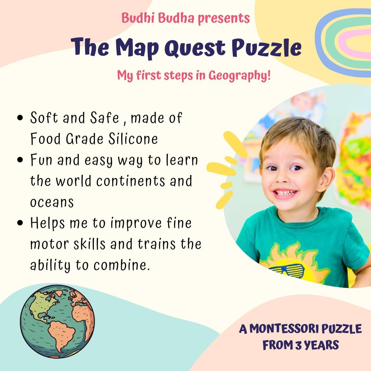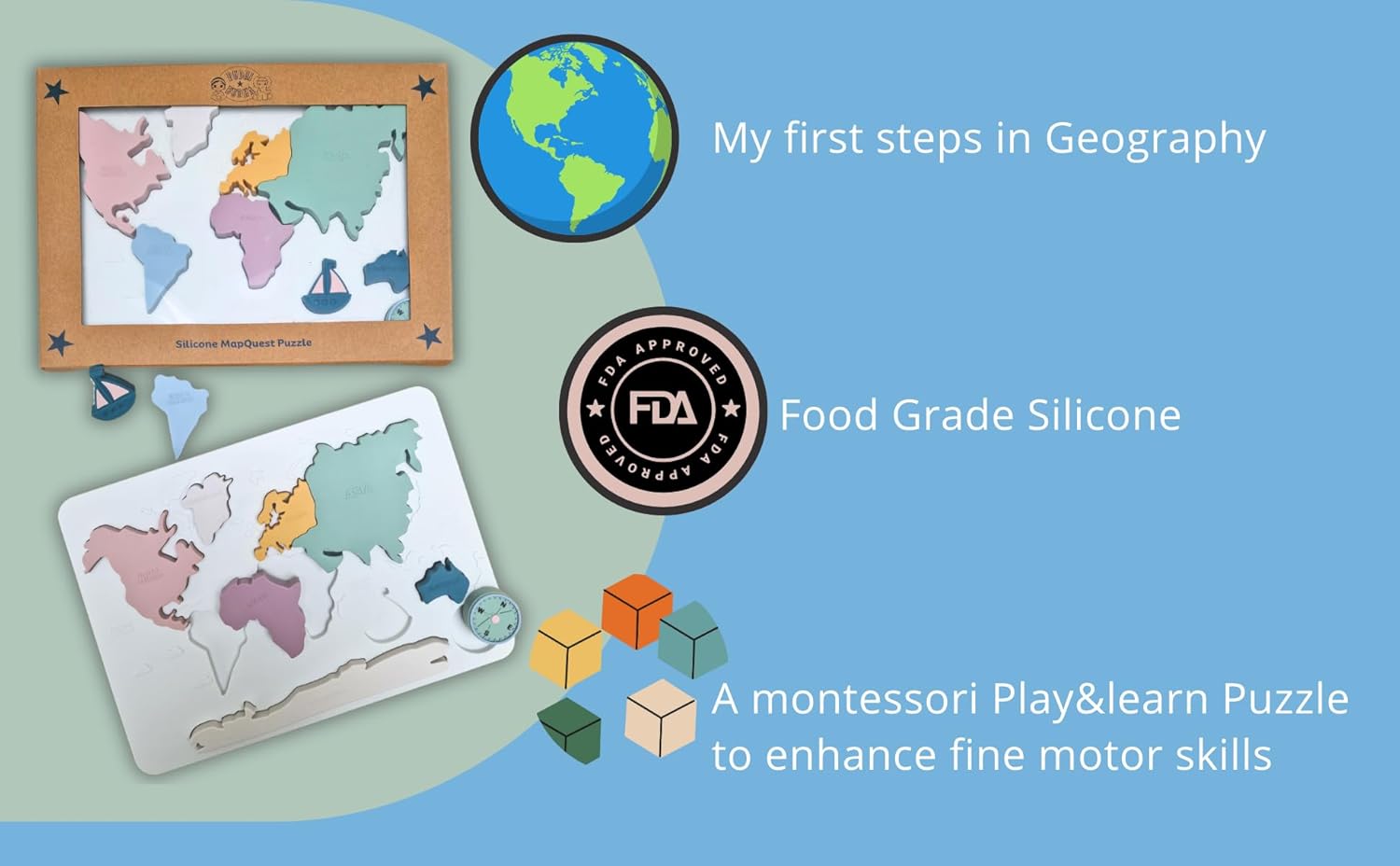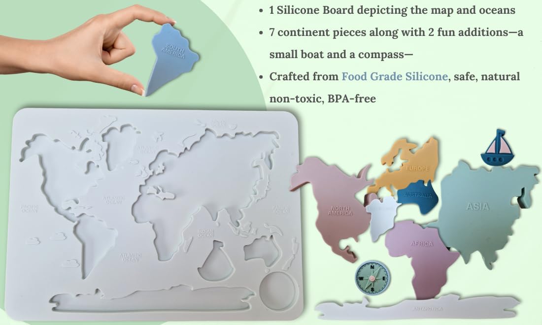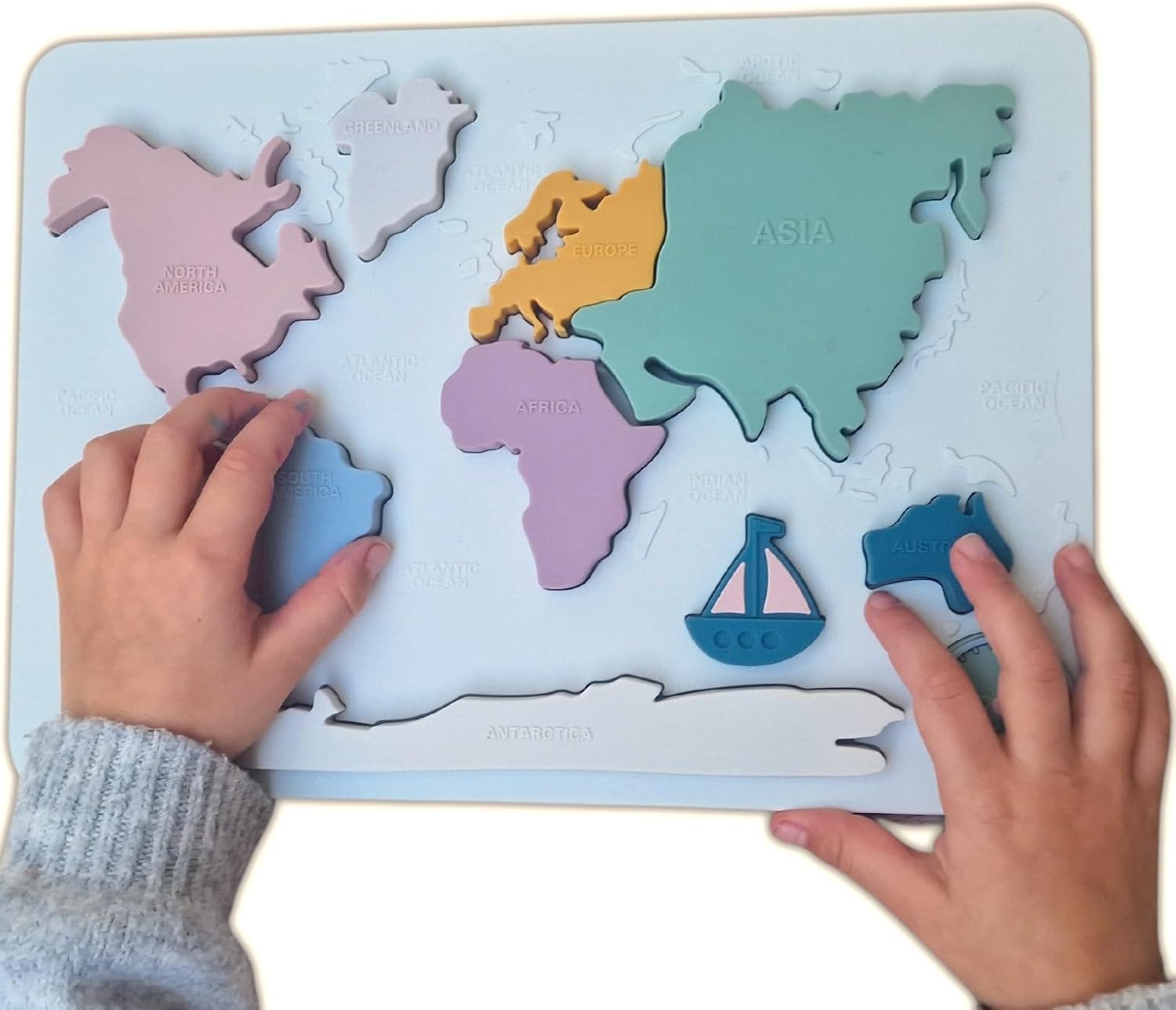 Initiez votre enfant dès 3 ans à la découverte des continents et des mers avec ce puzzle éducatif en silicone alimentaire, alliant sécurité, douceur et apprentissage ludique selon les principes Montessori.