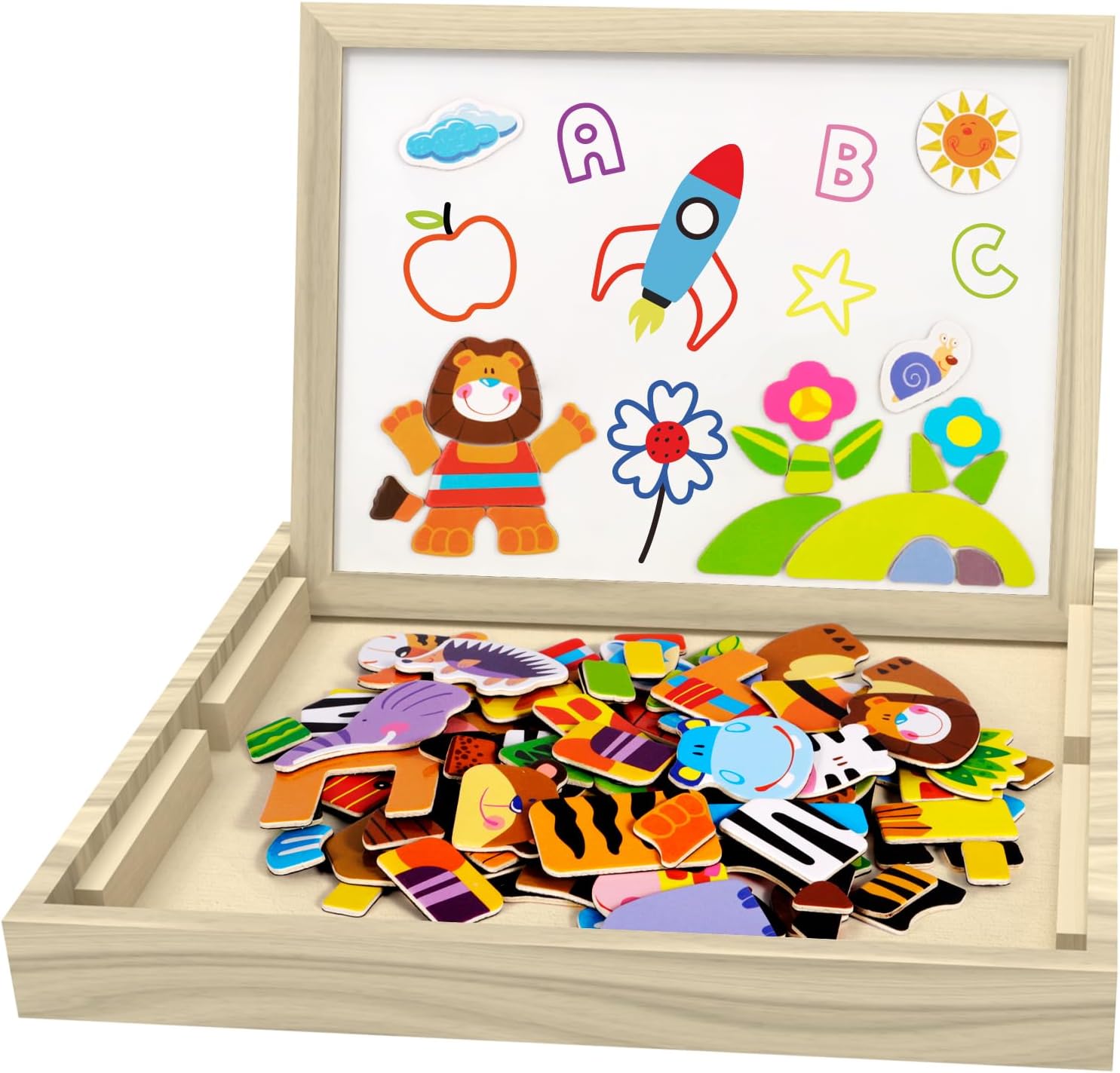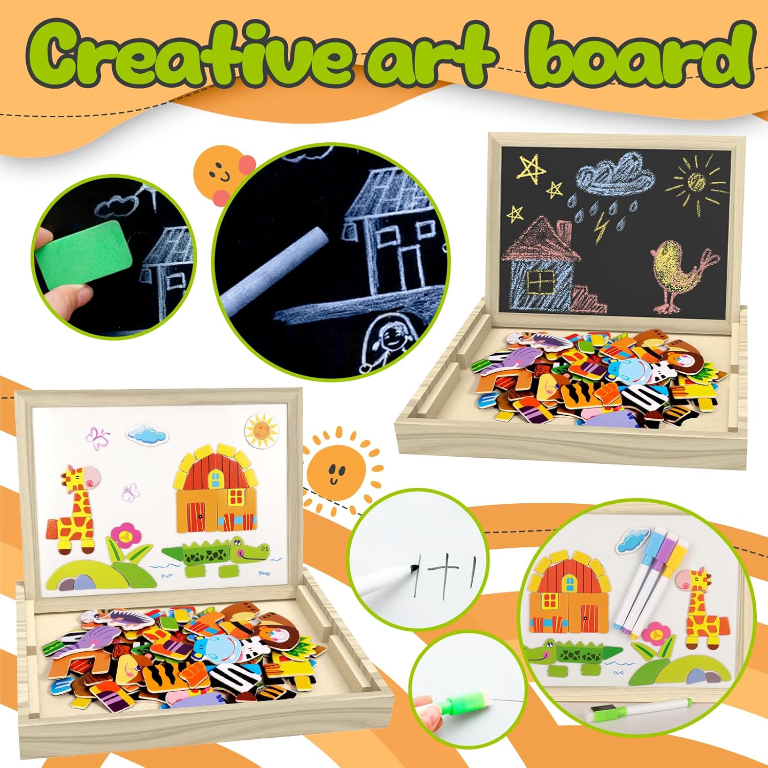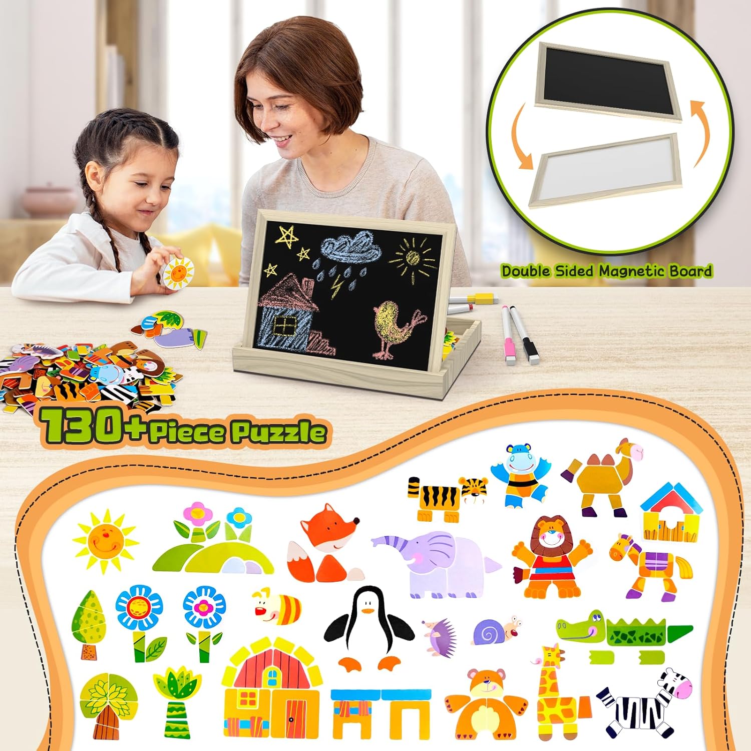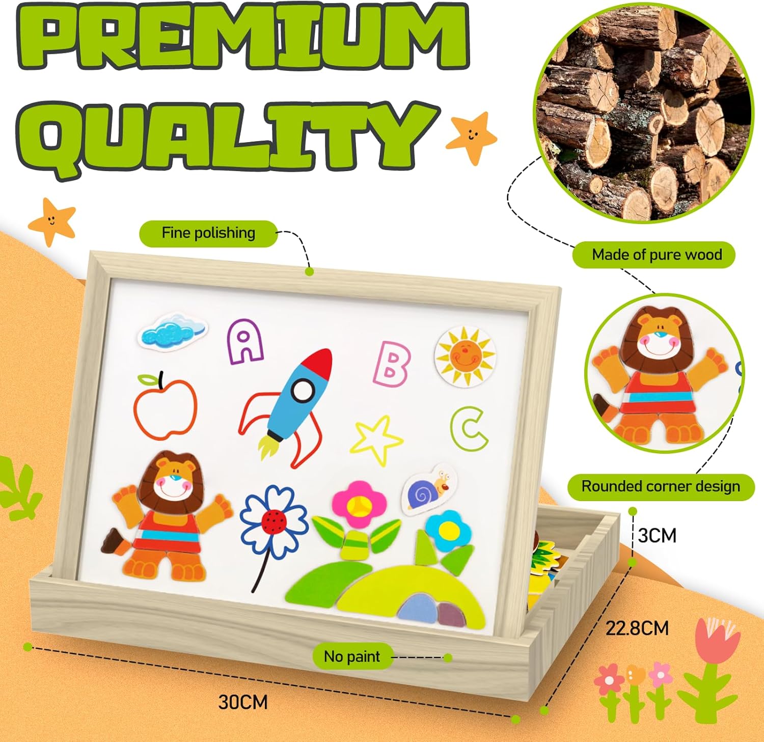 Stimulez la créativité et l’apprentissage de votre enfant dès 3 ans avec ce puzzle magnétique en bois Montessori, doté de 135 pièces, d’une planche double face et d’accessoires éducatifs.