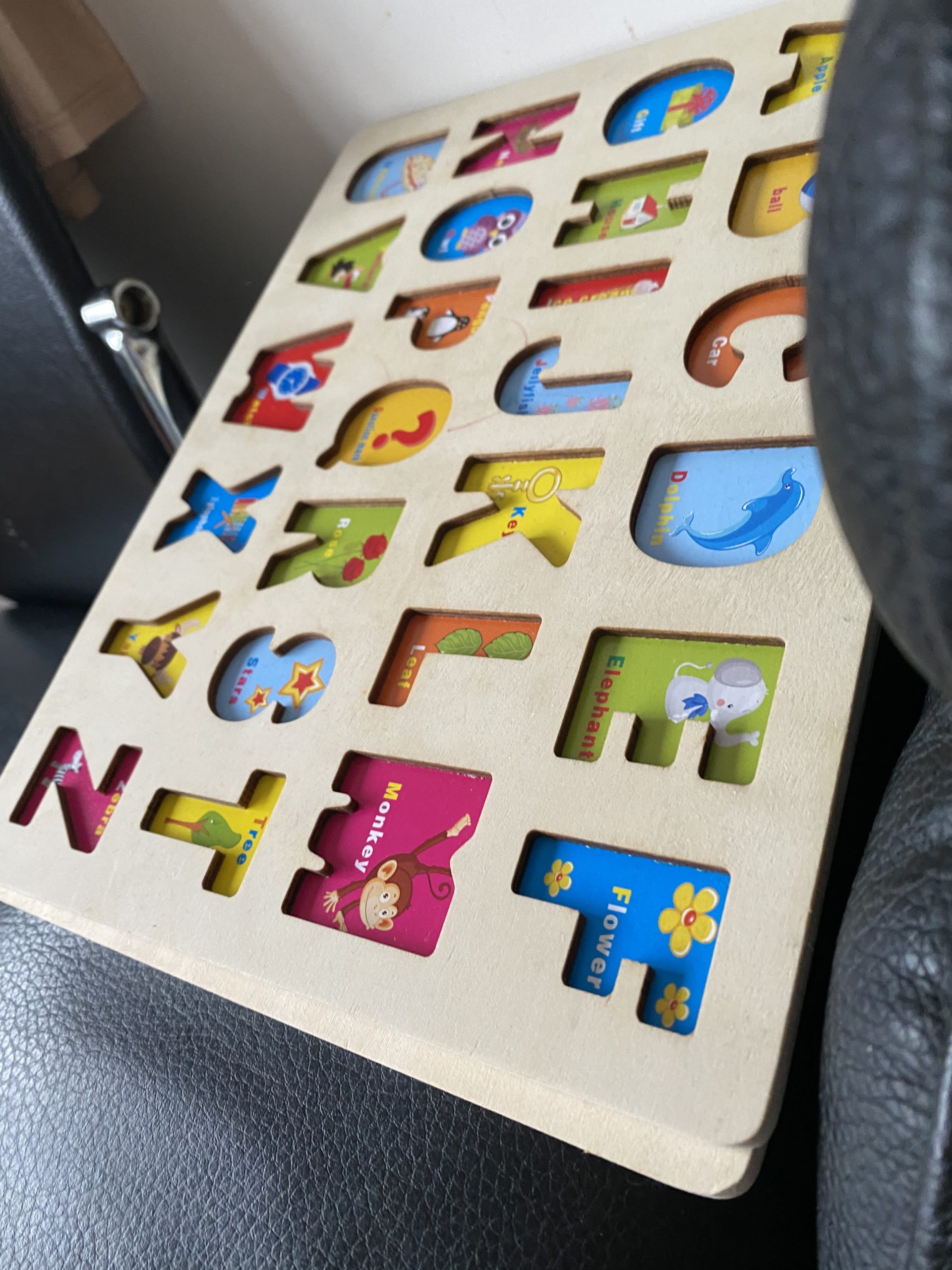 - Un puzzle de l’alphabet : Il comporte les 26 lettres de l’alphabet anglais en majuscule. Sous chaque lettre se trouve une image colorée commençant par la même lettre pour aider à développer la reconnaissance des lettres et des mots.