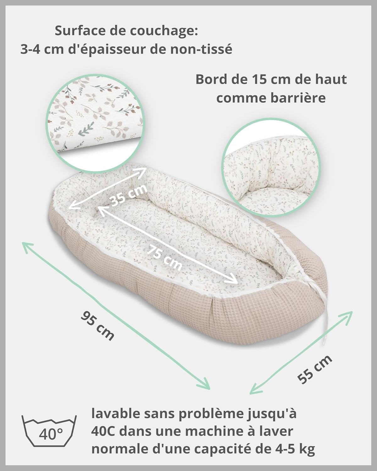 Le produit est vraiment qualitatif, assez grand pour que bébé puisse y faire de bonnes siestes pendant quelques mois ! Le rembourrage est parfait et la couleur (vert sauge) vraiment jolie ! Je recommande