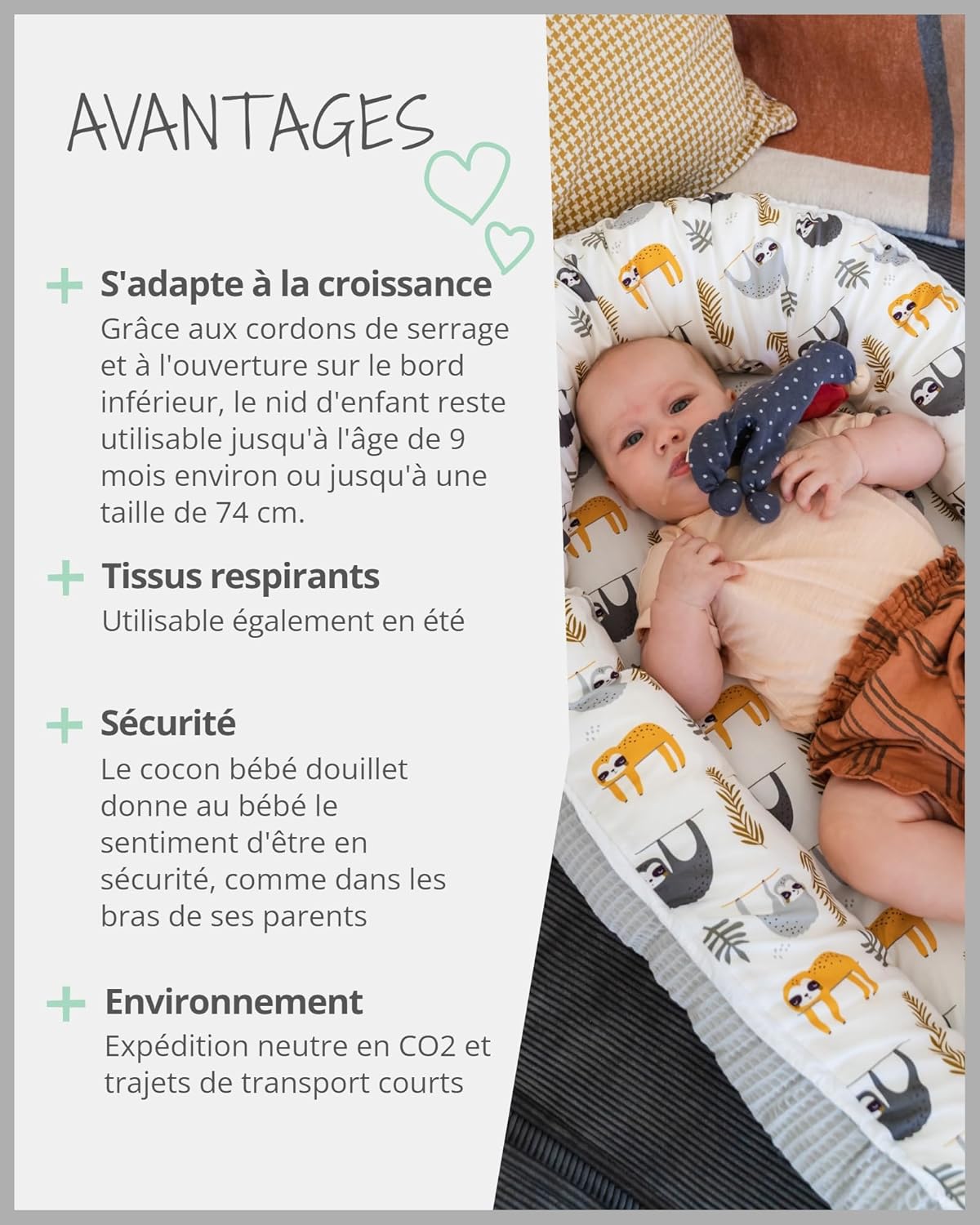 - Polyvalence : utilisable dans un lit parental, une poussette ou comme lit de voyage.