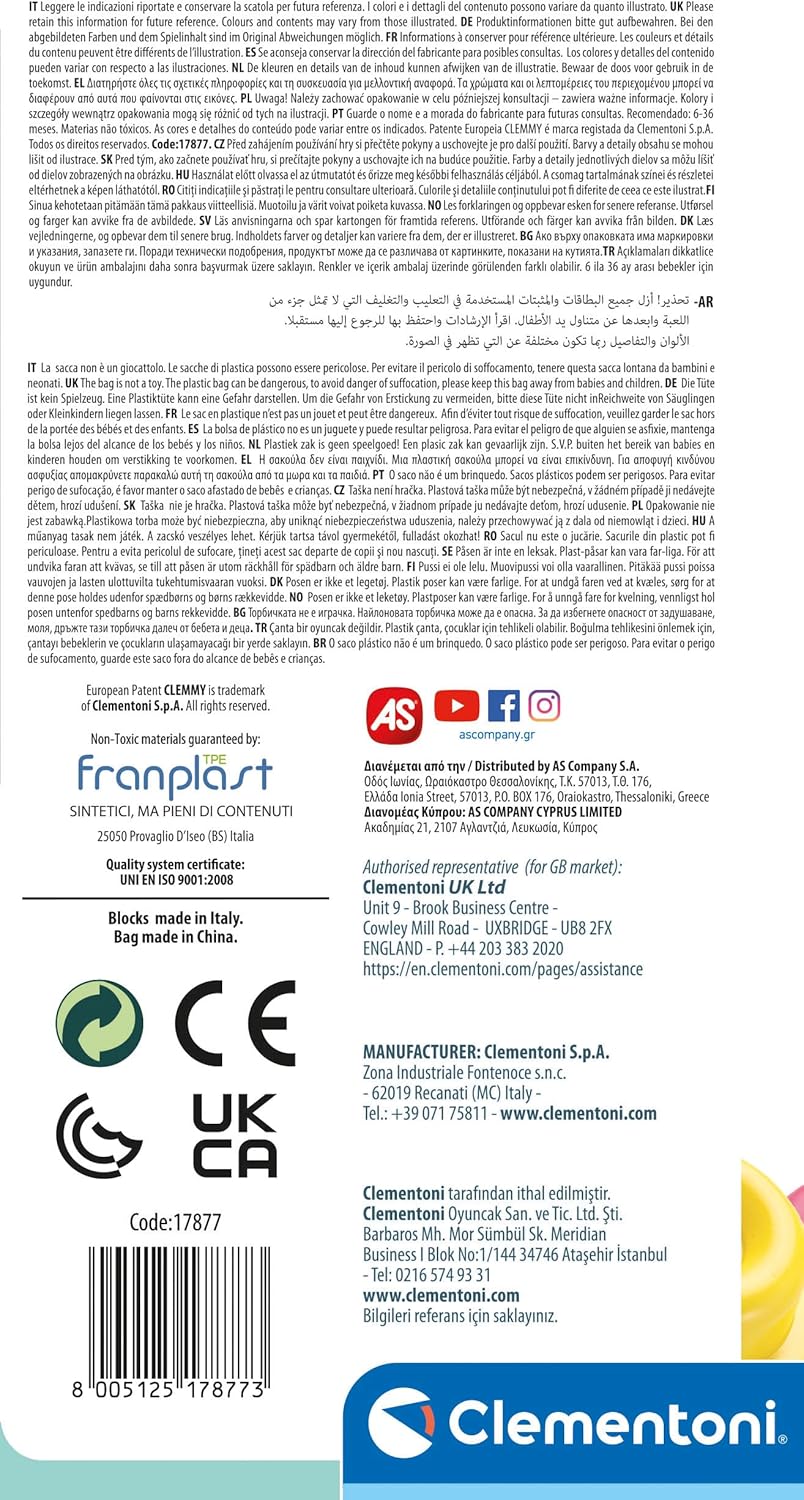 - Contenu : un sac souple transparent avec 20 cubes Clemmy.