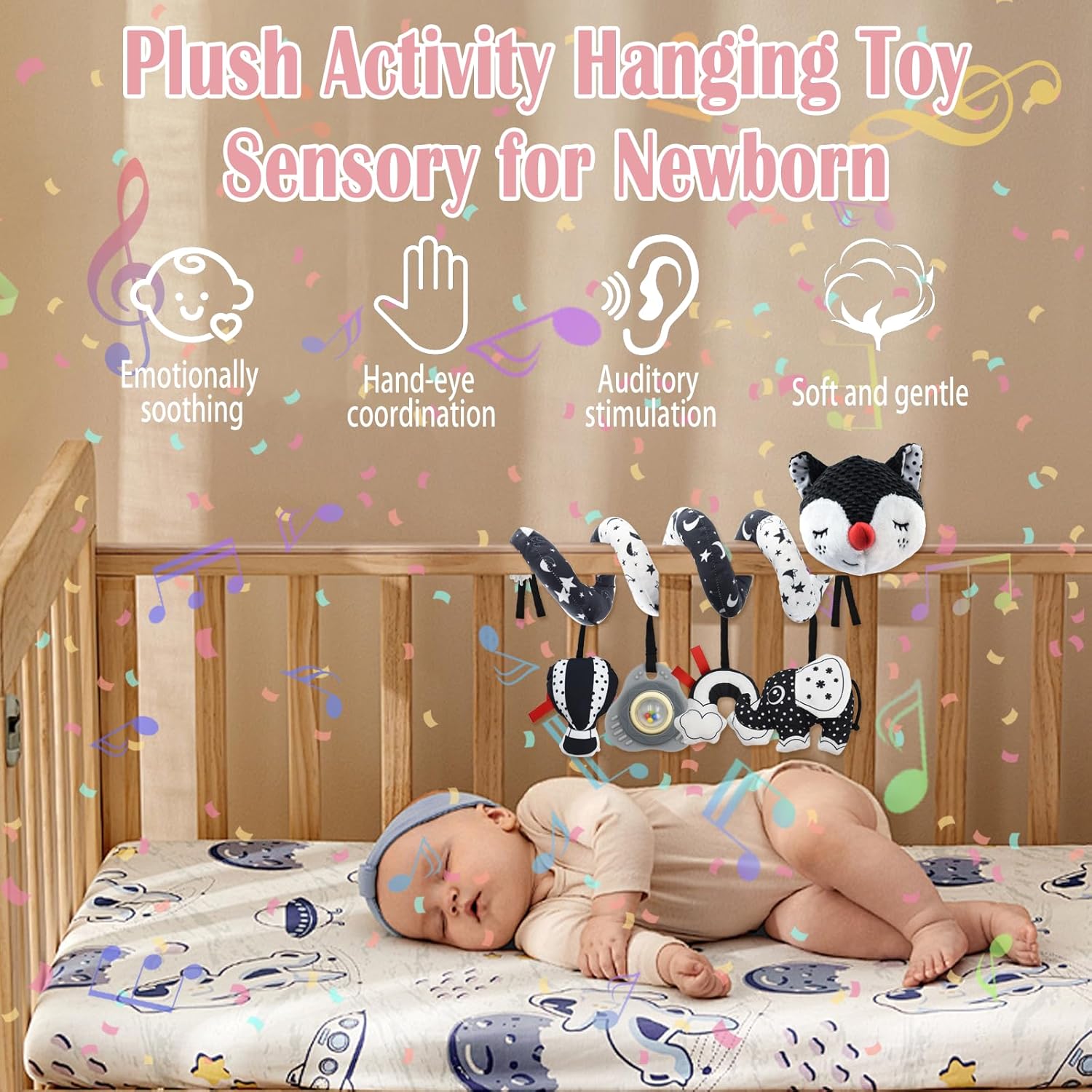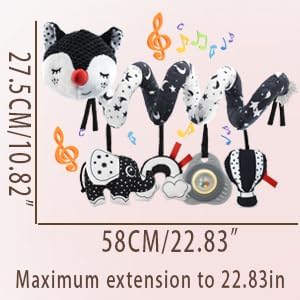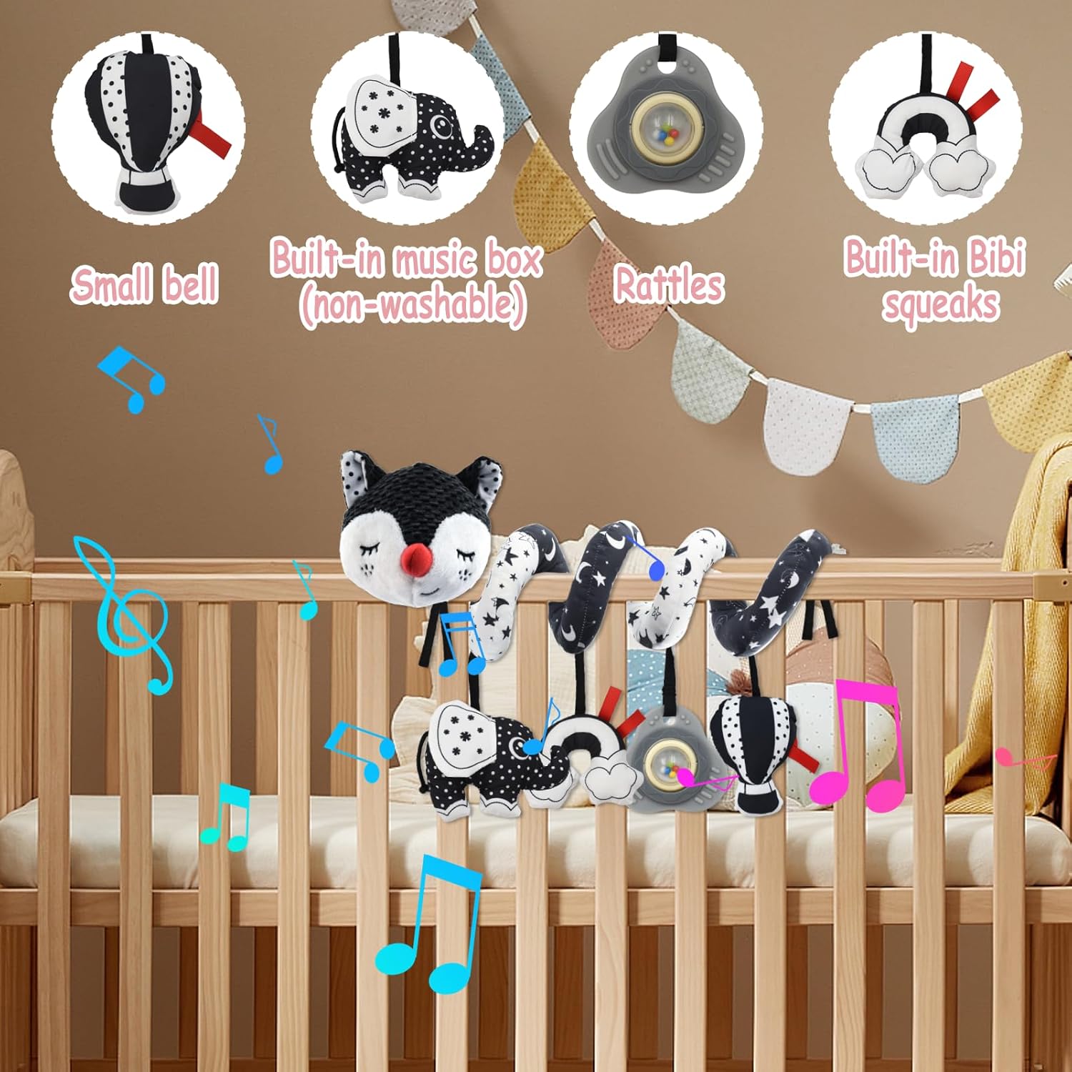 Les couleurs noir, blanc et rouge sont spécialement choisies pour capter l’attention des nourrissons, leur permettant de mieux distinguer les contrastes et d’améliorer leur perception visuelle. Cette spirale comprend plusieurs jouets suspendus aux formes attrayantes, comme un adorable renard musical, des vagues rotatives et des éléments sonores tels que des oreilles bruyantes et un couineur BB. Ces accessoires interactifs aident votre bébé à reconnaître les formes, les couleurs et les sons, tout en stimulant son imagination et en éveillant sa curiosité pour le monde qui l’entoure.