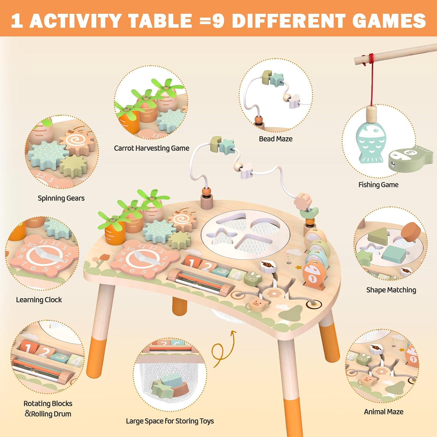 Découvrez la table d’activités Montessori en bois, un jouet éducatif 9-en-1 conçu pour éveiller la créativité, la motricité et la curiosité des enfants dès 1 an, tout en offrant un design compact et sécurisé.