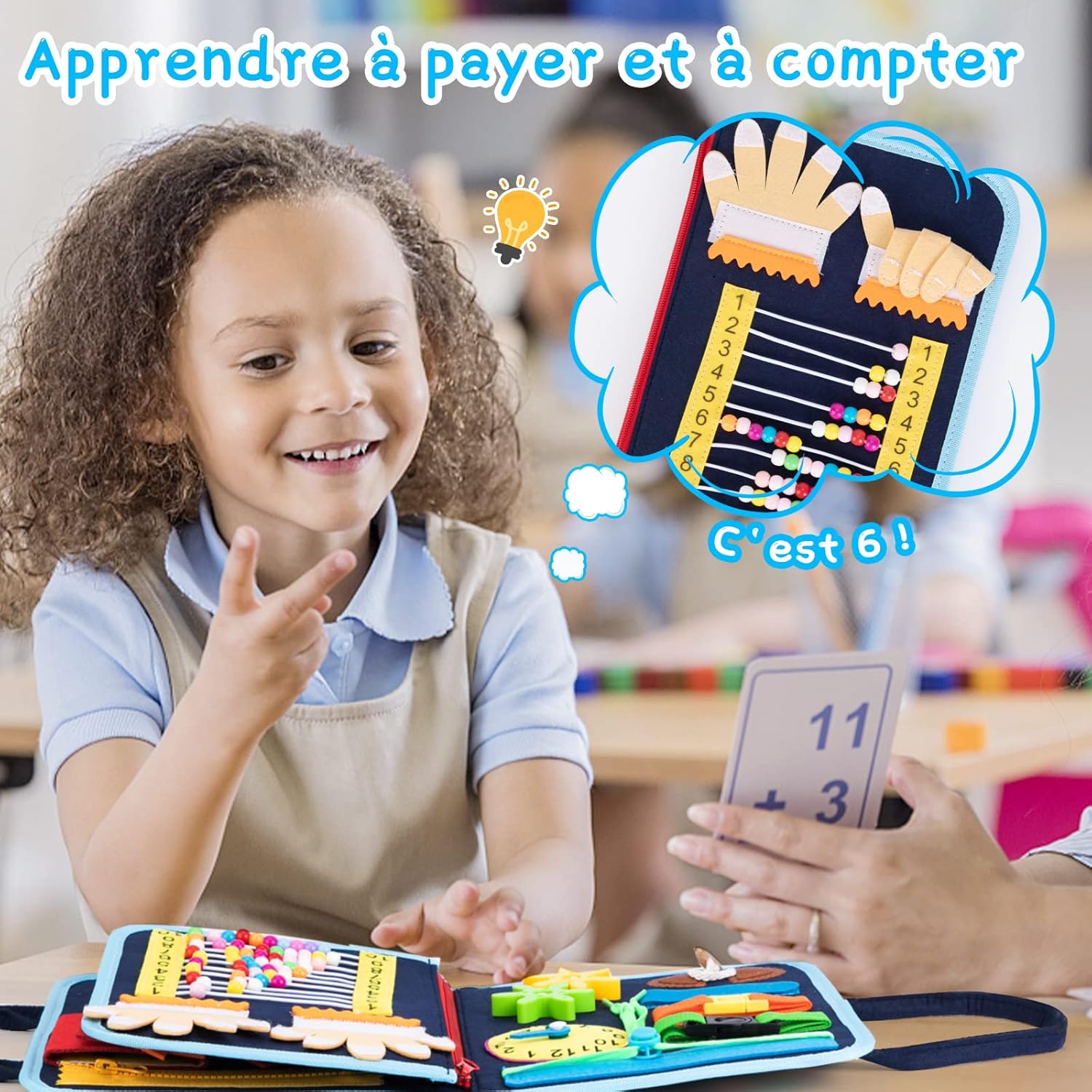 Excellent livre d'éveil, très bien conçu et très bien fait, de bonne qualité Apprentissage pour les gestes de la vie quotidienne avec les lacets, les boucles de ceinture etc, des formes en feutrine à scratcher, un boulier pour compter, c'est très complet, ma petite fille de 18 mois s'amuse longtemps avec.