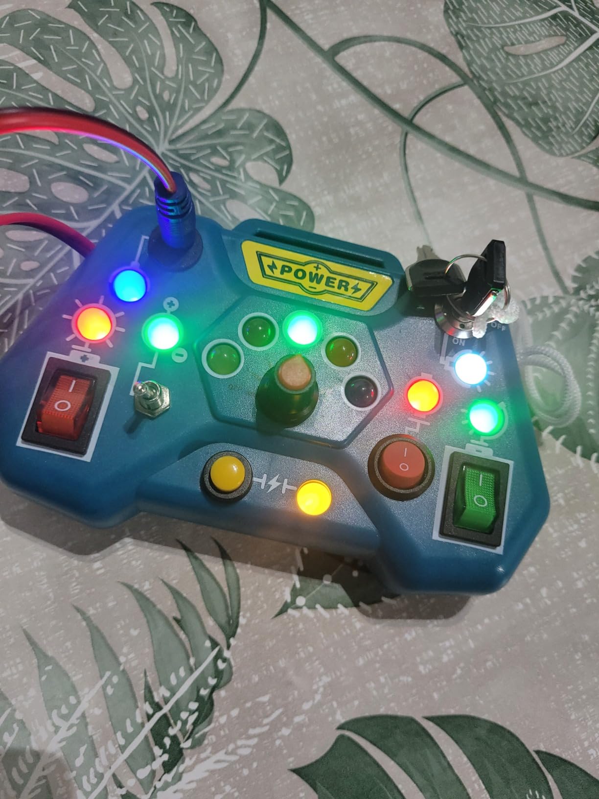 Mon fils de 24 mois s'amuse à appuyer sur chaque bouton, il est ravi par les lumières ! J'ai eu un problème à la réception au niveau de l'interrupteur à clés qui était mal fixé car il n'a pas de bague donc ça bougeait sans arrêt mais j'ai révisé le tout et c'est impeccable. C'est bien comme jeu, ludique, mon garçon a juste du mal encore à tourner la molette du milieu car cela demande un peu plus de force mais il aime beaucoup allumer et éteindre. J'ai cependant attaché les clés à la poignée de la manette car mon fils détache les clés de l'interrupteur et essaye de les mettre dans d'autres serrures. Vraiment ravie de mon achat, d'une taille pratique pour les déplacements et qui occupe sans faire de bruit et permet à mon enfant de se débrouiller. Je recommande