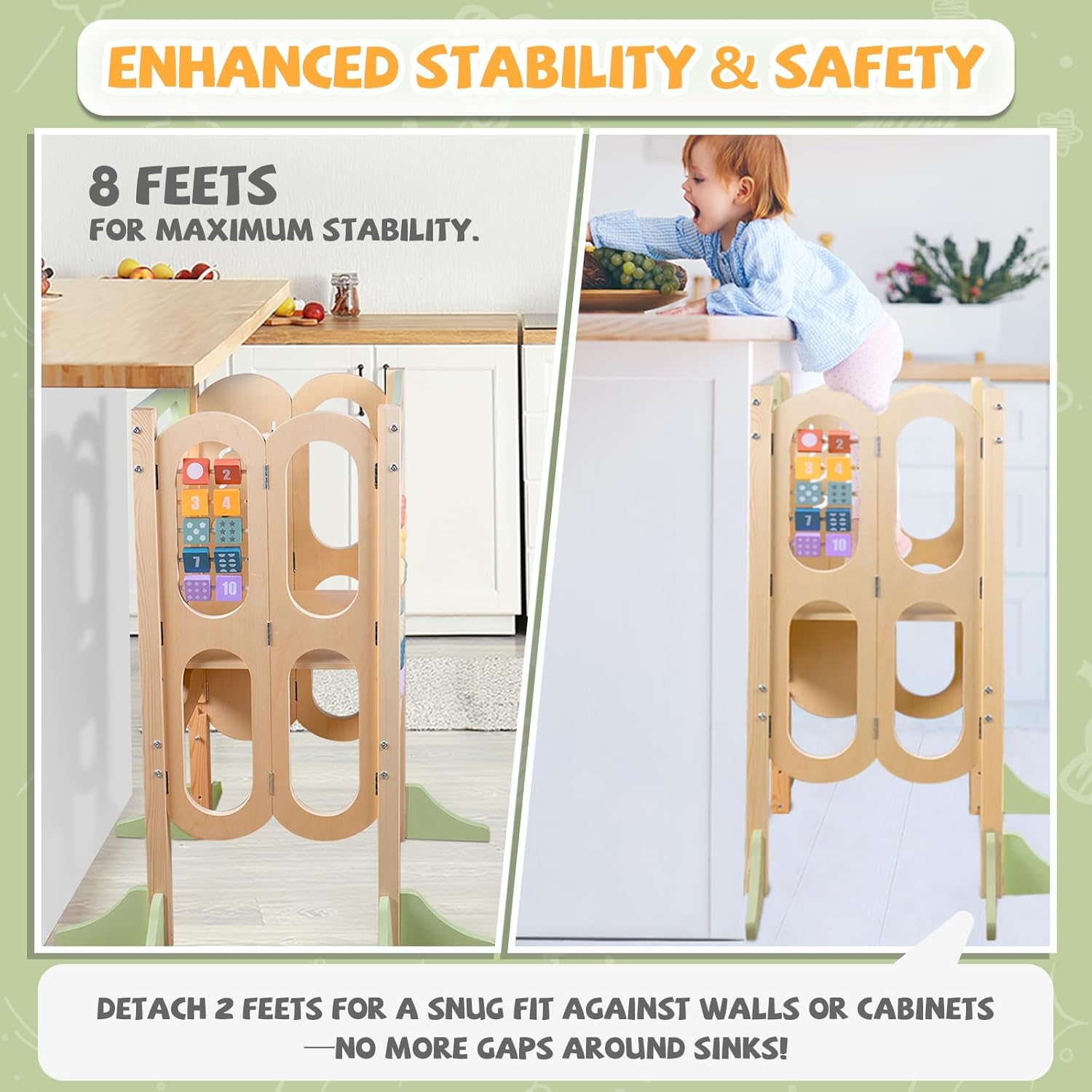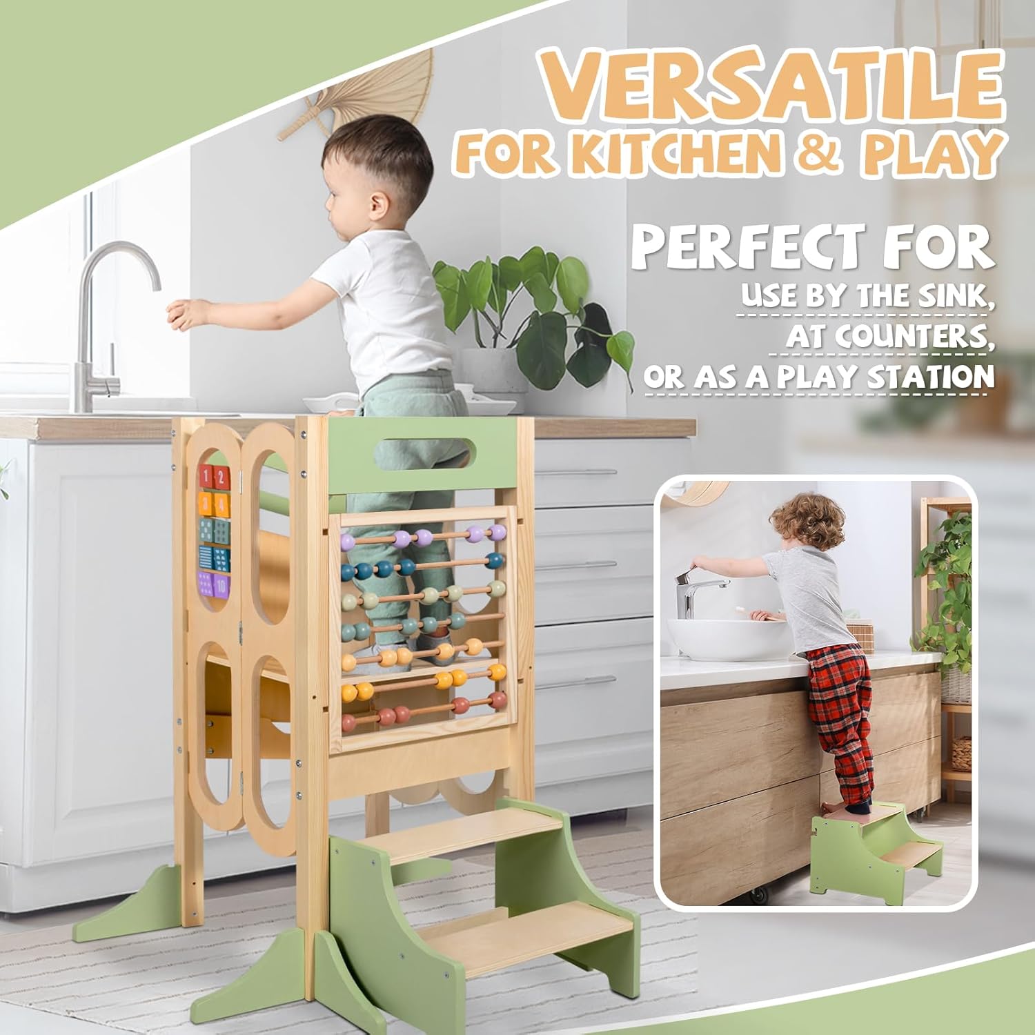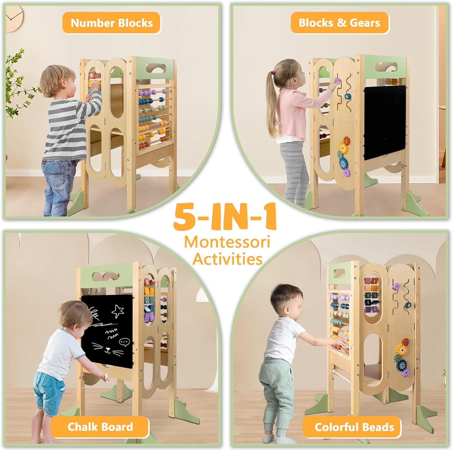 Offrez à votre enfant une tour Montessori 6 en 1 qui combine marche-pied, station d’activités éducatives et tableau noir pour stimuler son autonomie, sa créativité et sa croissance tout en sécurité.