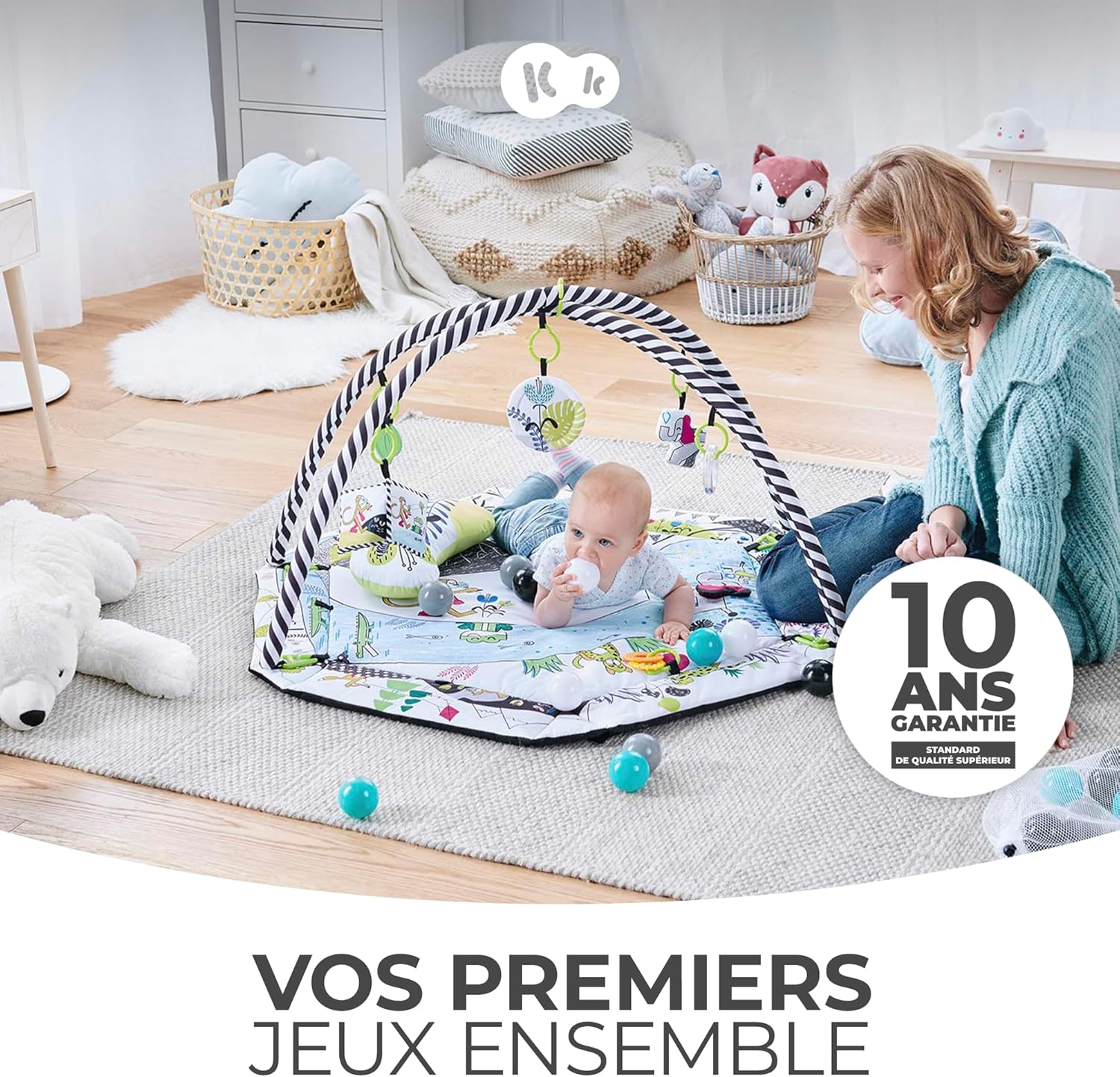 Ce tapis d’éveil ne se limite pas à une simple aire de jeu. Il se transforme également en piscine sèche, grâce à ses 20 balles colorées incluses dans le pack. Les deux arceaux réglables en hauteur sont habillés de revêtements doux et accueillent 7 jouets amovibles. Ces derniers, par leur diversité de textures et de couleurs, stimulent le toucher de votre enfant et l’encouragent à étirer ses bras.