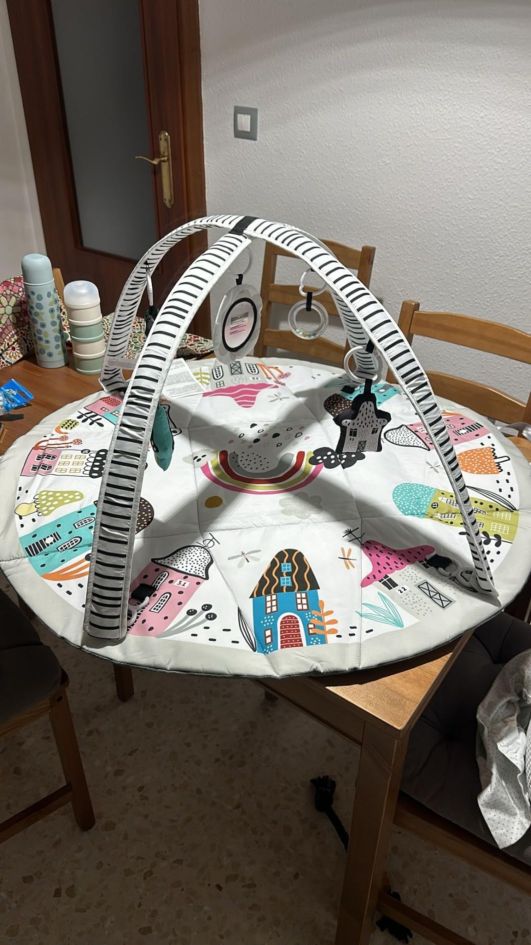 Gimnasio infantil con juguetes. Un modelo de gimnasio redondo, con los juguetes para colgar y barras de plástico que se colocan encima. Es fácil de montar y de desmontar, con la comodidad de que tiene un sistema de velcro para, después, tomar forma de bolsa y guardarlo en cualquier sitio. Los colores son muy bonitos y la textura agradable, perfecta para un bebé. Lo único, que pensaba que el colchoncito sería más grueso. No está mal, pero queda algo fino para el contacto con el suelo, sobre todo nosotros que tenemos tipo gres y es fácil que le llegue el frío. Así que tocará ponerle una manta gruesa o algo de por medio. Los móviles que incluye son tres peluches, un sonajero y un espejo, a buena altura para que intente cogerlos pero no llegue del todo. Y, si los coge, aunque se golpeara en la cabeza, son blandito y no se haría daño. Menos con el sonajero, que es más recio. Os dejo foto con mi gato adulto encima para que os hagáis una idea del tamaño, es más grande de lo que esperaba así que aguantará bien varios meses. Contenta con el producto, lo recomiendo.