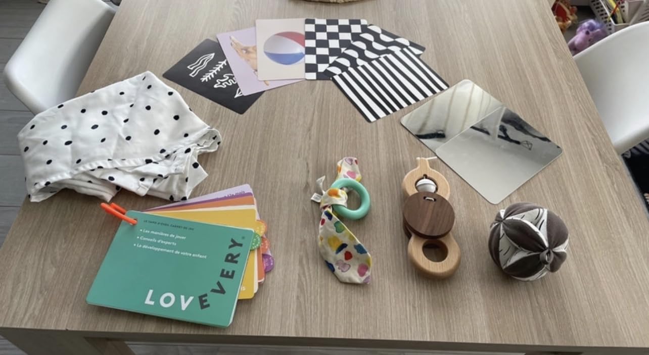 Les cartes éveil l'intérêt de l'enfant à c'est début... Tout comme la balle pour la coordination des mouvements Le seule bémol serait l'épaisseur du tapis (ne protège pas assez) donc mettre un tapis de salon ou autre en dessous Je recommande l'article pour ceux qui hésitent