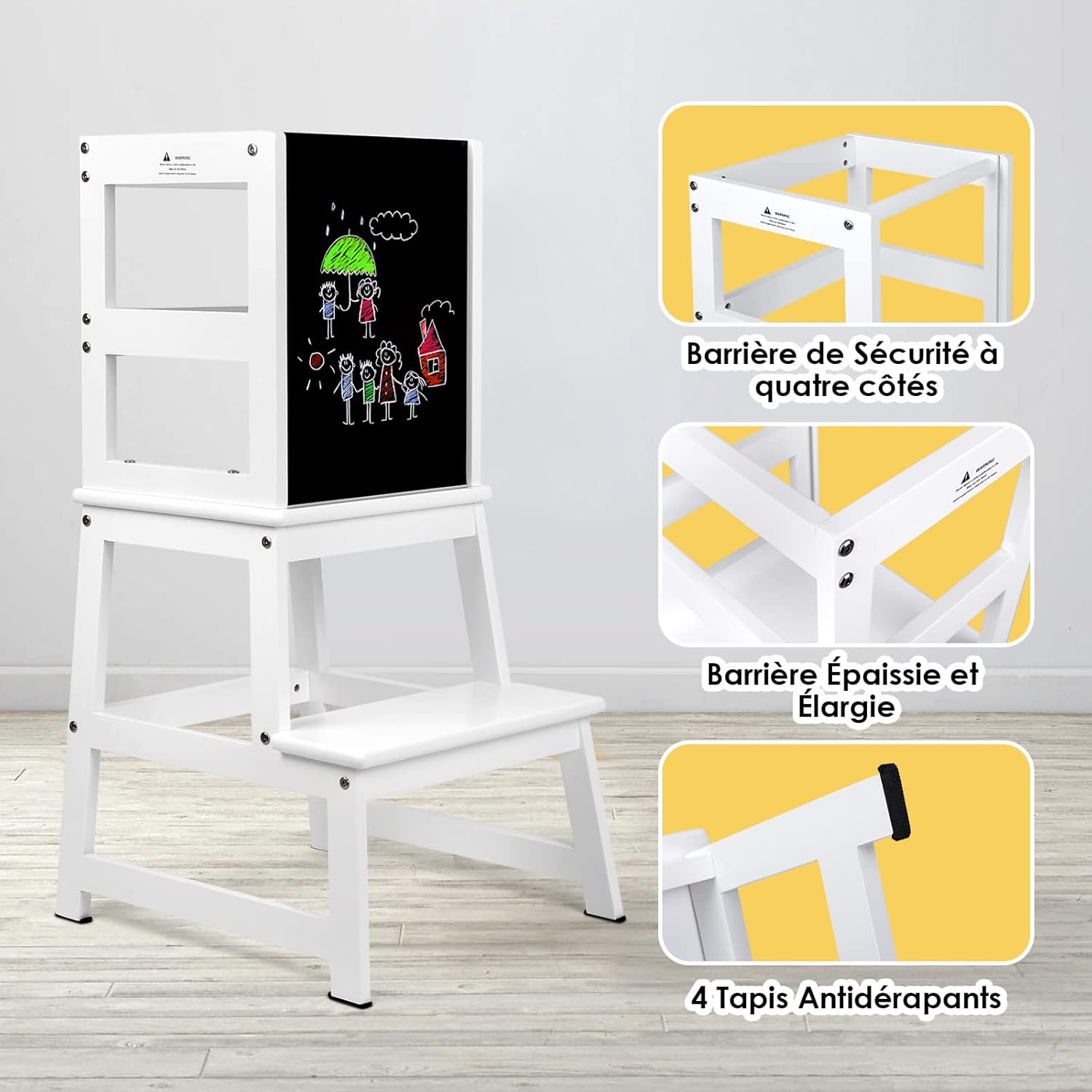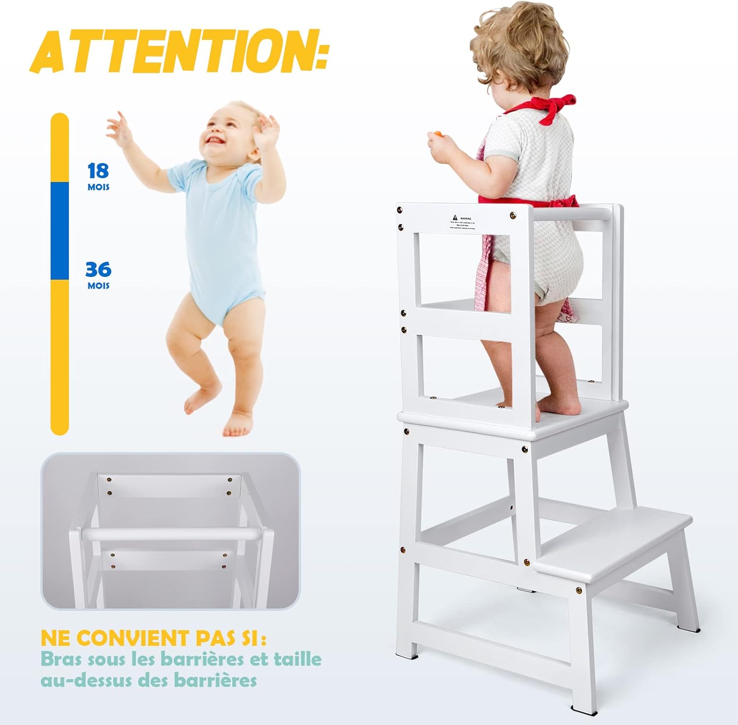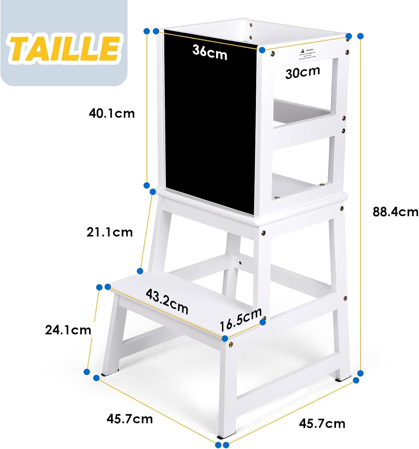 La fonctionnalité ne s’arrête pas là ! Cette tour d’apprentissage est équipée d’un escabeau amovible, offrant une grande flexibilité d’utilisation. Une fois que votre enfant grandit, vous pouvez détacher la clôture pour transformer la tour en un marchepied à double couche. Avec ses dimensions compactes de 88 x 46 x 46 cm et sa capacité de charge maximale de 90 kg, cet accessoire durable accompagnera votre famille pendant de nombreuses années.