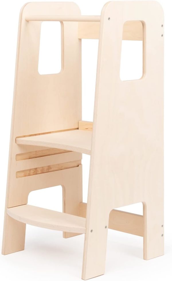 Cette tour est vraiment bien pensée. Simple à monter, esthétique et facile d'utilisation pour les petits (ma fille a 13mois). Seuls bémols, il manquerai une barre de sécurité à ajouter dans le dos de l'enfant lorsqu'il est dessus pour éviter une chute en arrière et lorsque les doigts un peu gras touchent le bois clair non vernis ça laisse quelques traces.
