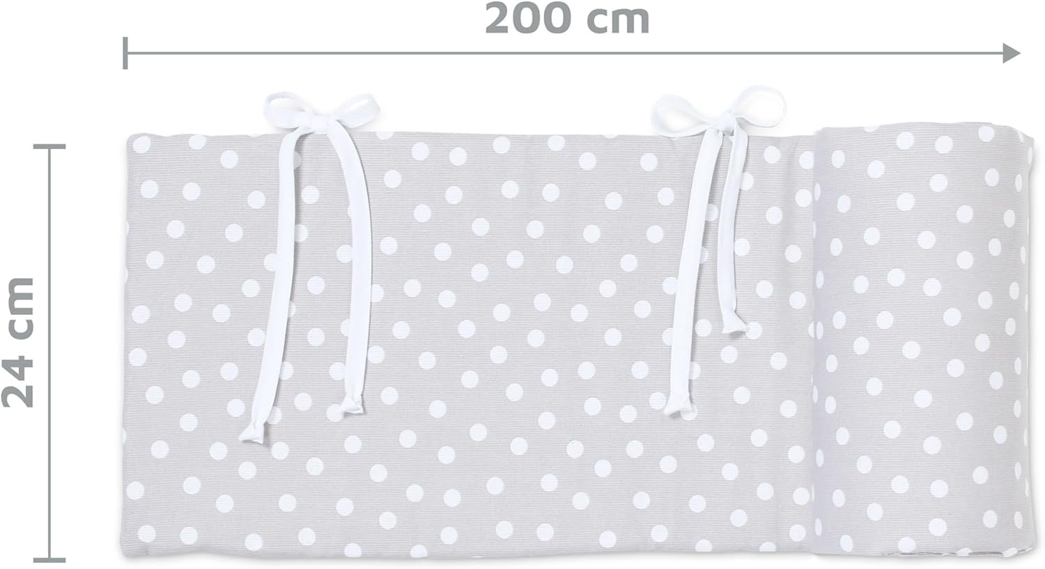 Apportez sécurité et confort à votre bébé avec ce tour de lit montessori XXL en gris perle à pois blancs, conçu en coton doux, respirant et certifié sans substances nocives.