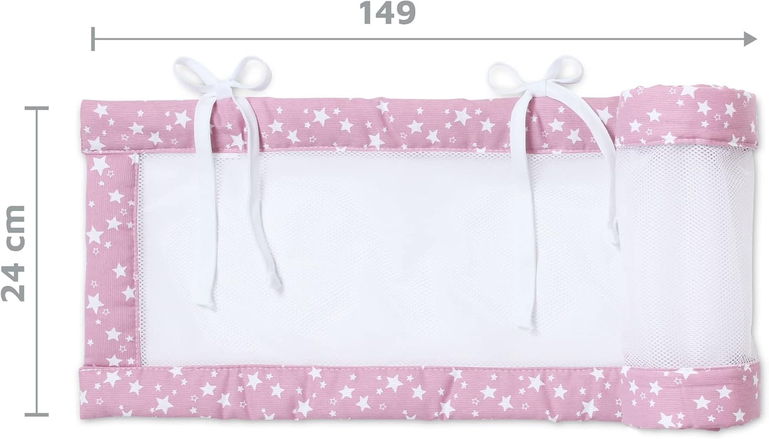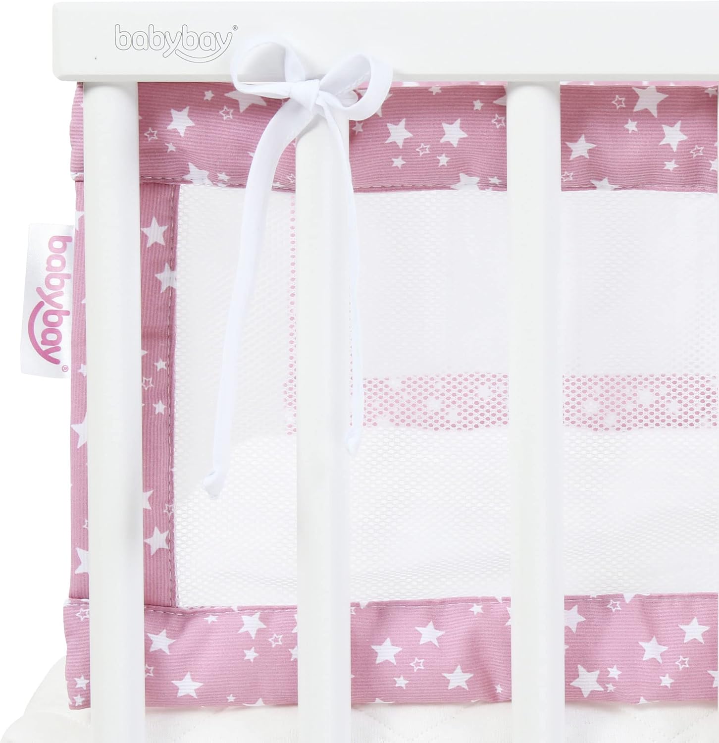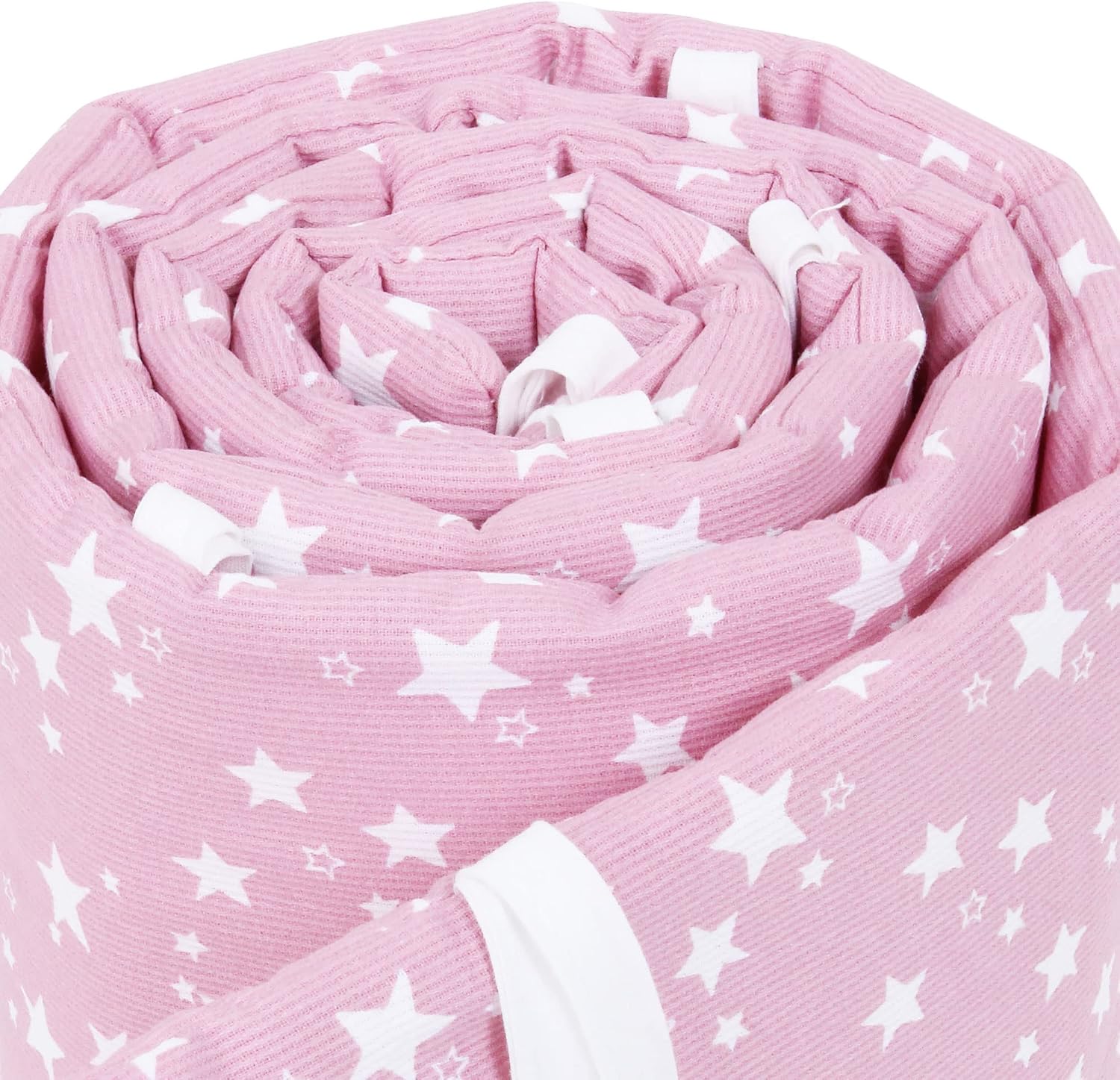 Apportez sécurité et confort à votre bébé avec ce tour de lit montessori en maille piquée framboise et étoiles blanches, respirant, lavable et certifié OEKO-TEX.