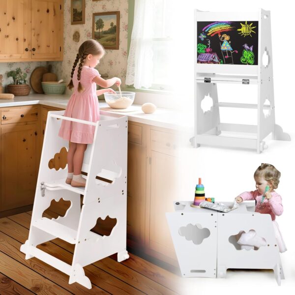 Offrez à vos enfants une tour d’observation Montessori pliable 3-en-1 avec tableau noir et garde-corps, alliant sécurité, créativité et autonomie grâce à sa conception robuste et multifonctionnelle.