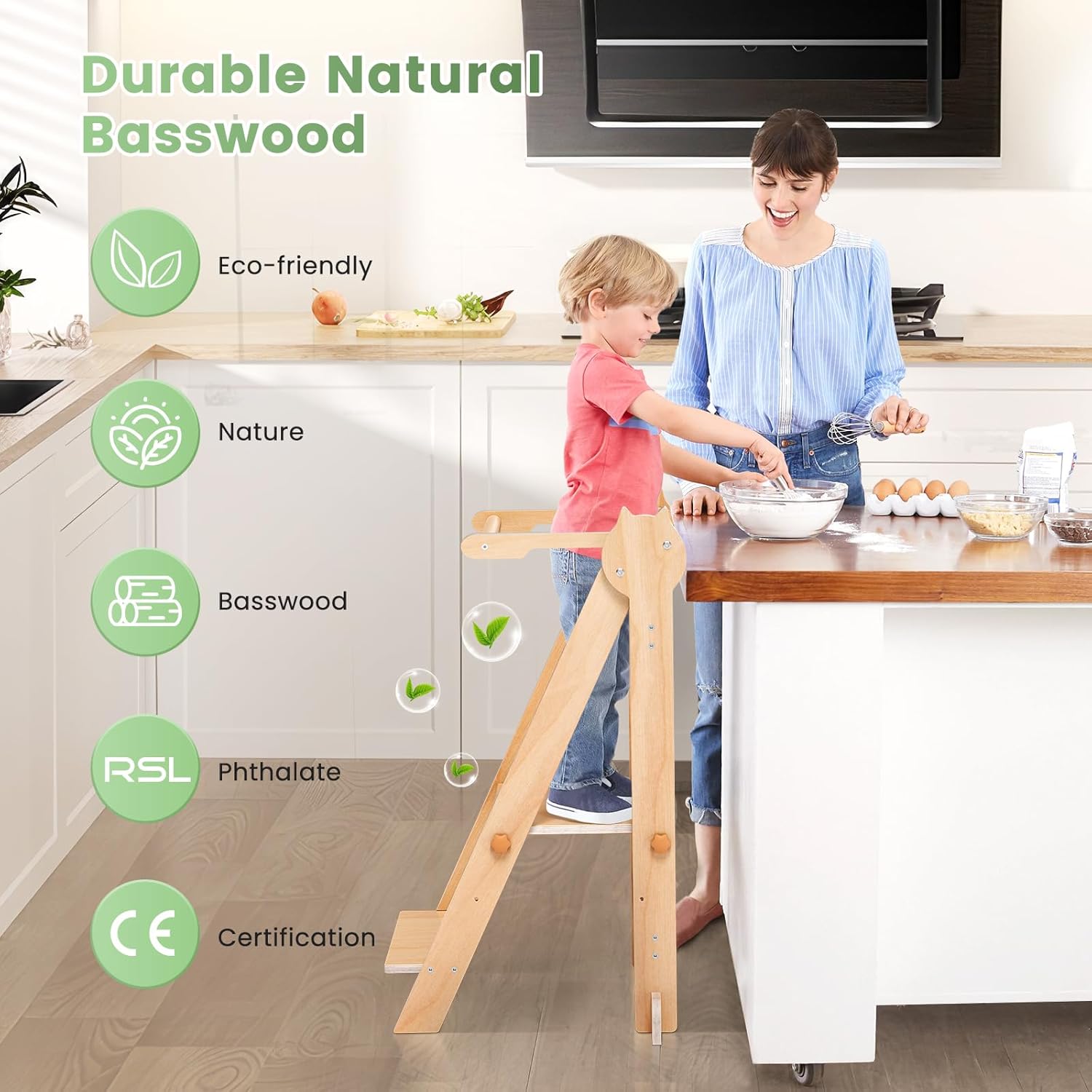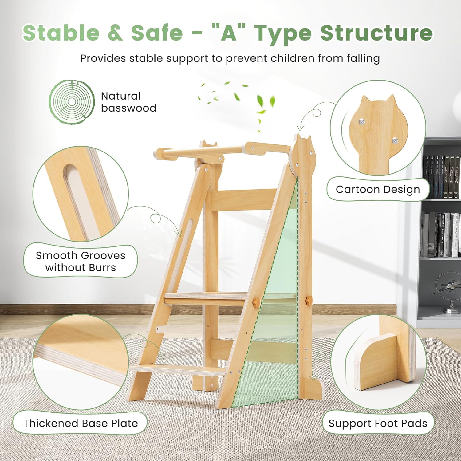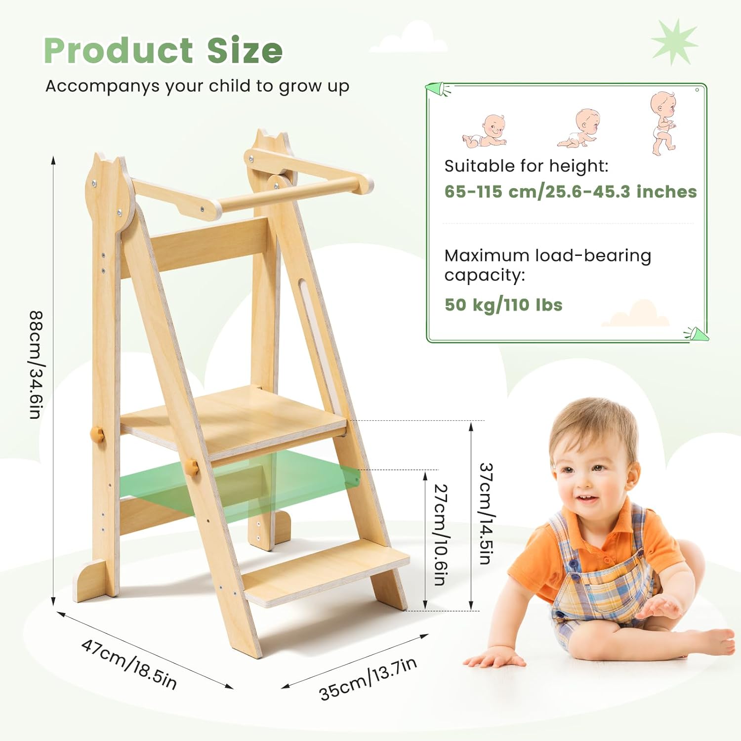 Pour une tranquillité d’esprit totale, cette tour d’observation est fabriquée conformément aux normes strictes EN71 relatives à la sécurité des jouets en Europe. Les revêtements utilisés sont à base d’eau et totalement sans danger pour les enfants, tandis que chaque bord est soigneusement arrondi pour éviter tout risque de blessure. Le mécanisme de pliage est équipé d’un système de verrouillage sécurisé pour protéger votre enfant lors des moments d’exploration ou d’apprentissage. Que ce soit pour cuisiner ensemble ou découvrir de nouvelles activités, vous pouvez être sûr que votre enfant évolue dans un environnement sécurisé.