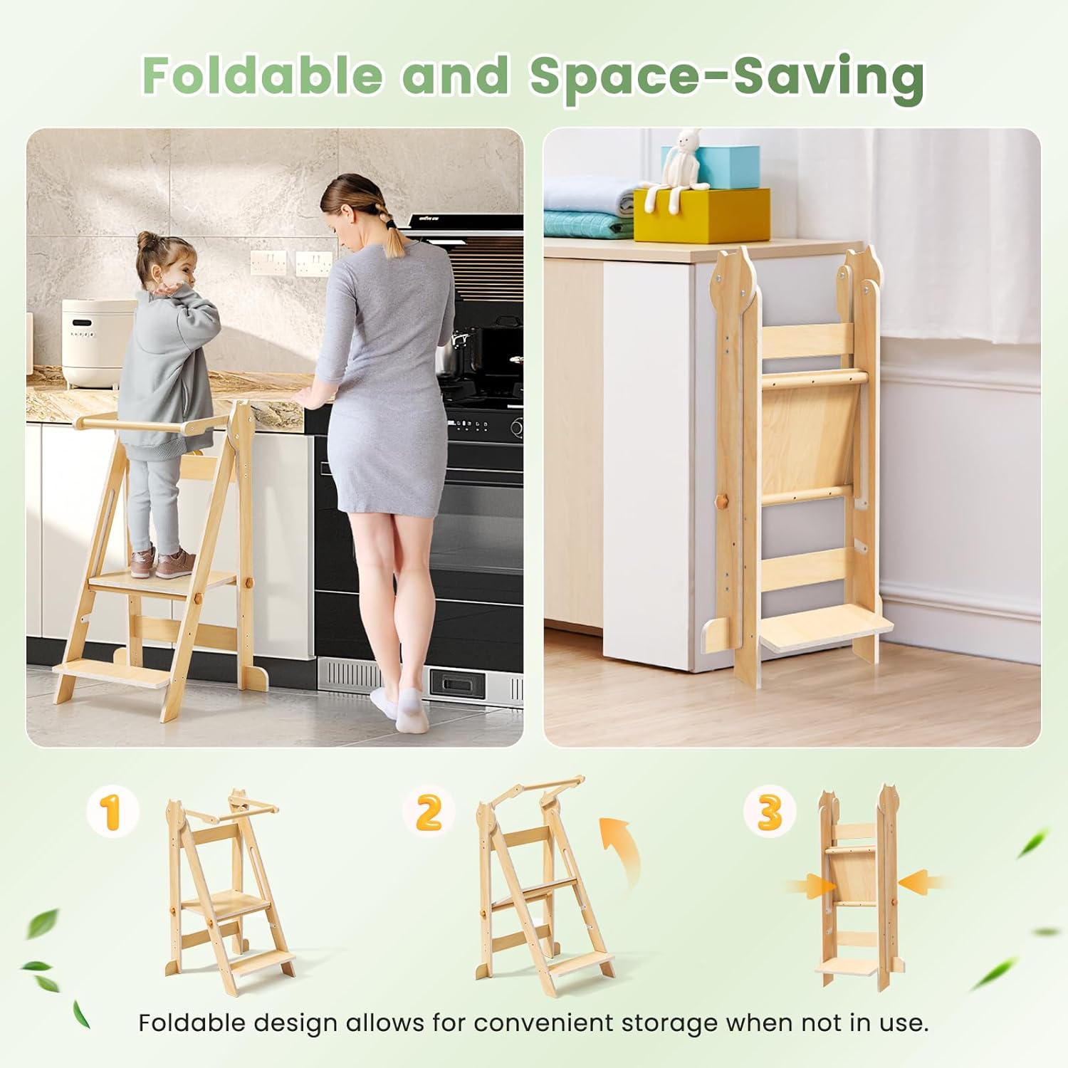 Optimisez l’espace et encouragez l’autonomie de votre enfant avec notre tour d’observation Montessori pliable en bois, ajustable en hauteur, sécurisée grâce à ses barrières 360° et sa base anti-bascule, facile à assembler et conforme aux normes de sécurité européennes.