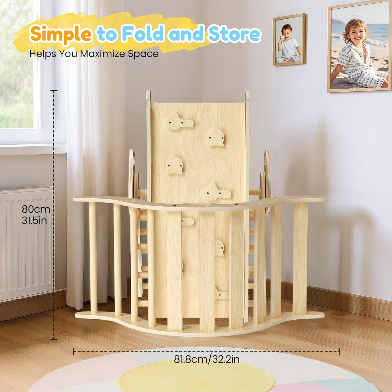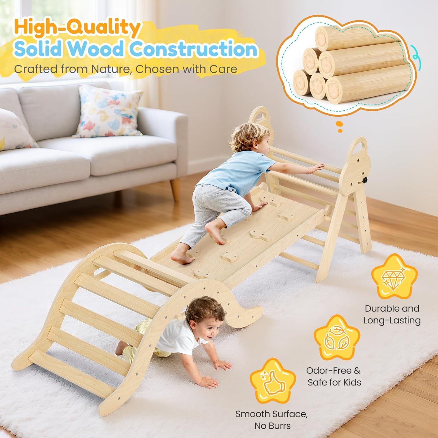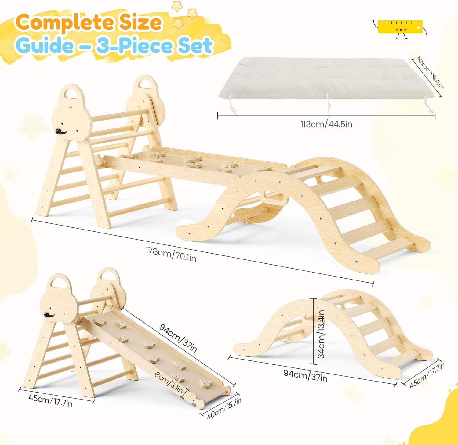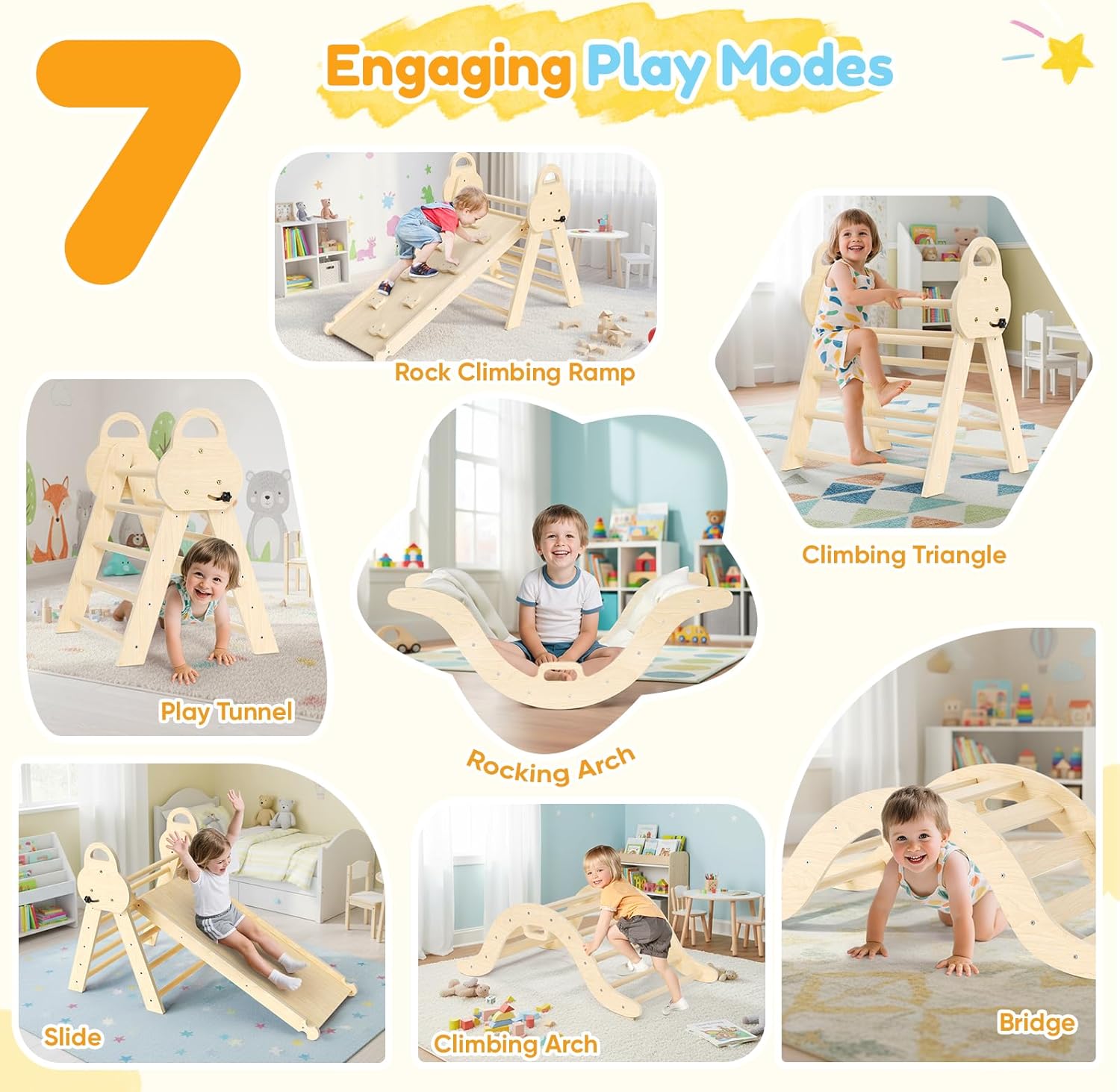 Ce triangle d’escalade Montessori en bois 7 en 1 évolutif et sécurisé stimule la motricité des tout-petits avec ses multiples combinaisons d’utilisation, alliant escalade, toboggan et durabilité.