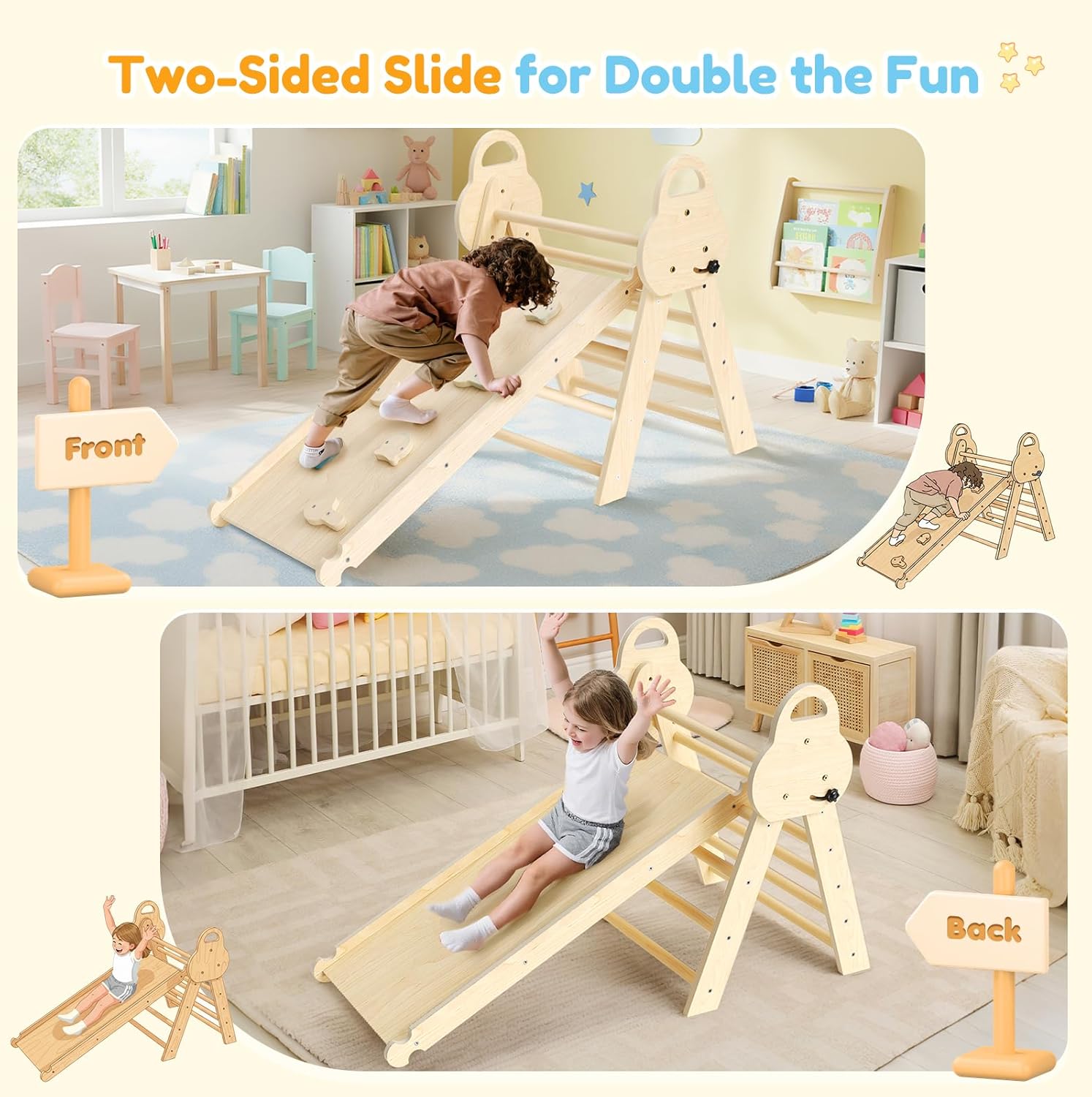 Ce triangle d’escalade ne se limite pas à une seule fonction. D’un côté, il offre une structure d’escalade colorée avec 8 points d’appui arc-en-ciel aux teintes douces, stimulant la coordination et la force des petits grimpeurs. Retournez-le, et il se transforme instantanément en un toboggan amusant, parfait pour des heures de glissades joyeuses. Avec cette fonctionnalité double face, vos enfants n’auront jamais le temps de s’ennuyer.