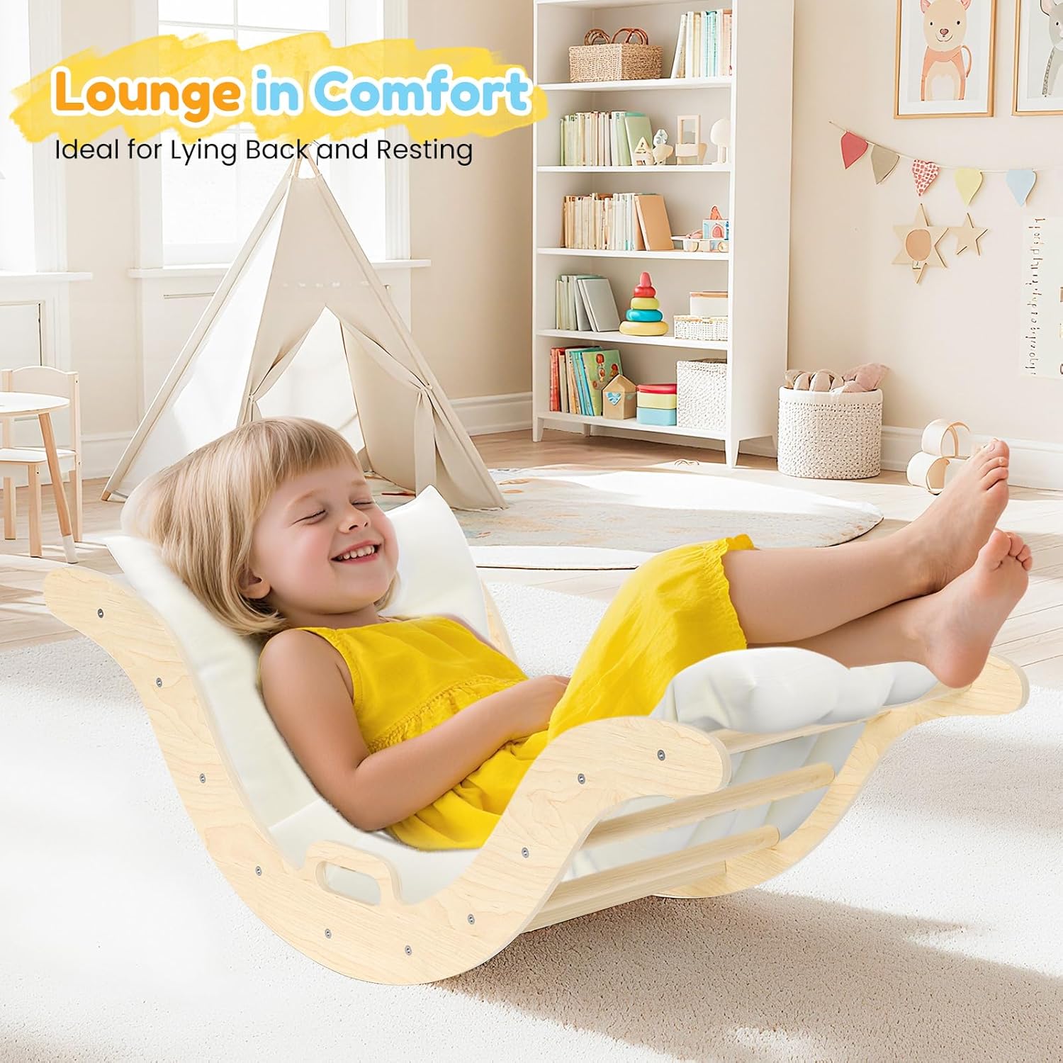 Un indispensable des jouets montessori ! Mon enfant a adoré, il en fait différents usages, un petit pont quand il joue, un petit lit à bascule pour dormir et lire, une arche d'escalade ... pleins d'autres choses qui lui permettent de s'amuser seul. Le bois est de bonne qualité et ne blesse pas. Le montage est très facile et rapide. Le coussin inclut est très confortable