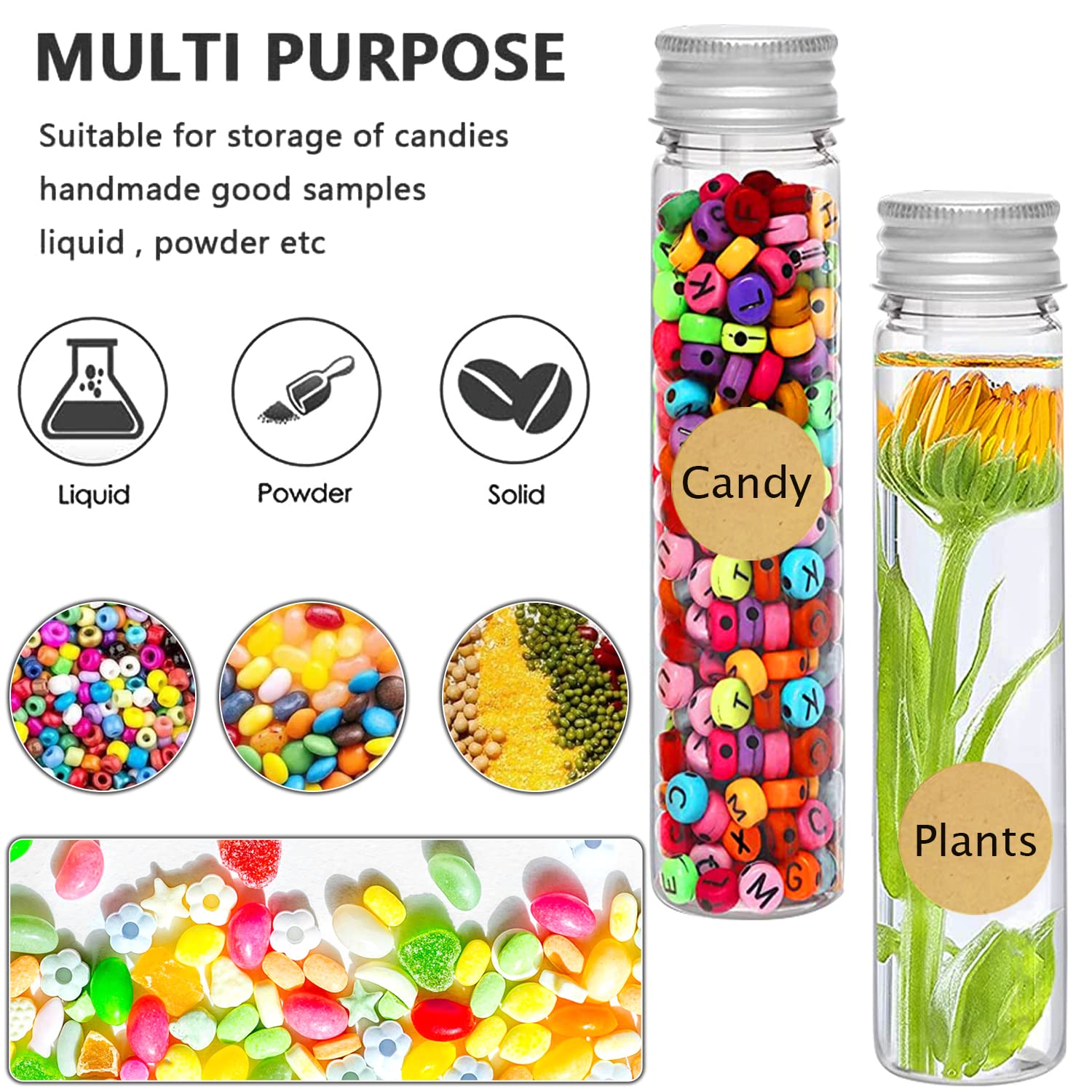 Découvrez le tube à essai en plastique transparent 110 ml, un accessoire robuste avec bouchon hermétique et autocollants inclus, idéal pour stocker vos petits objets et projets créatifs.