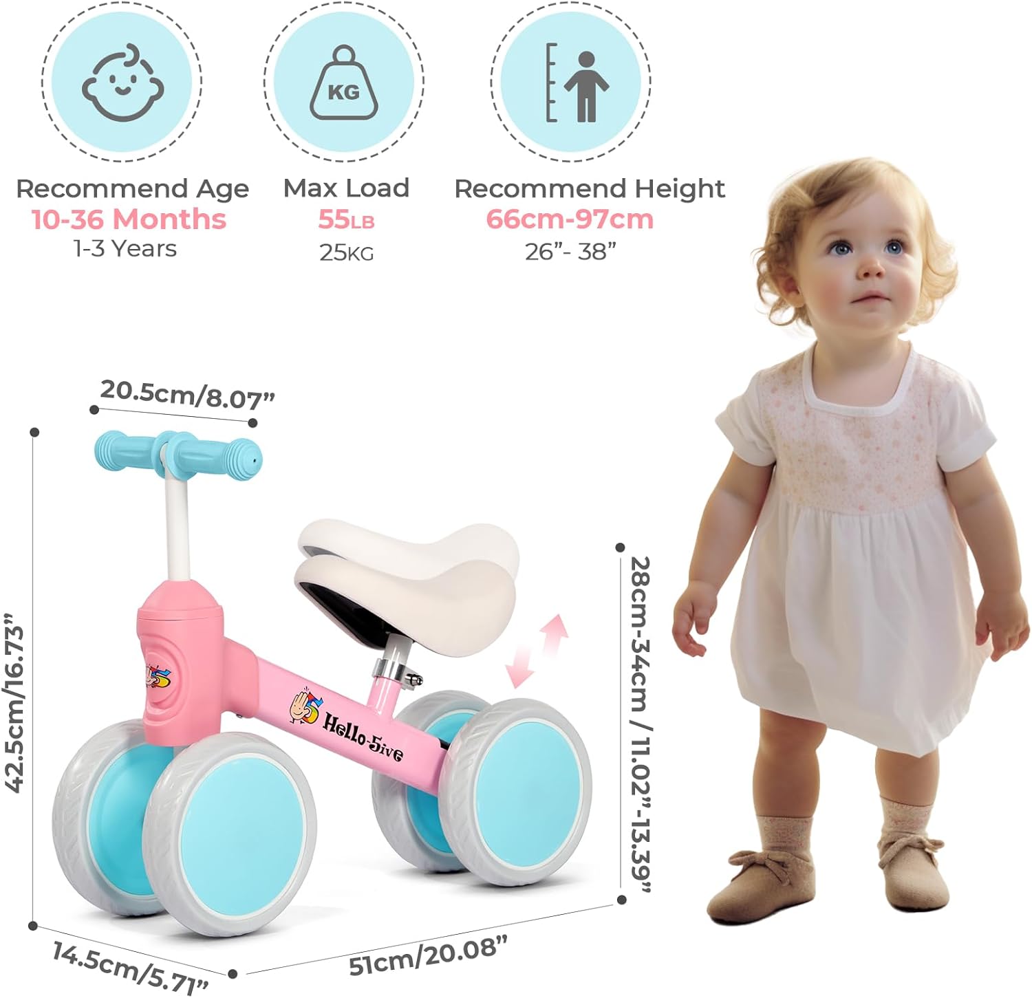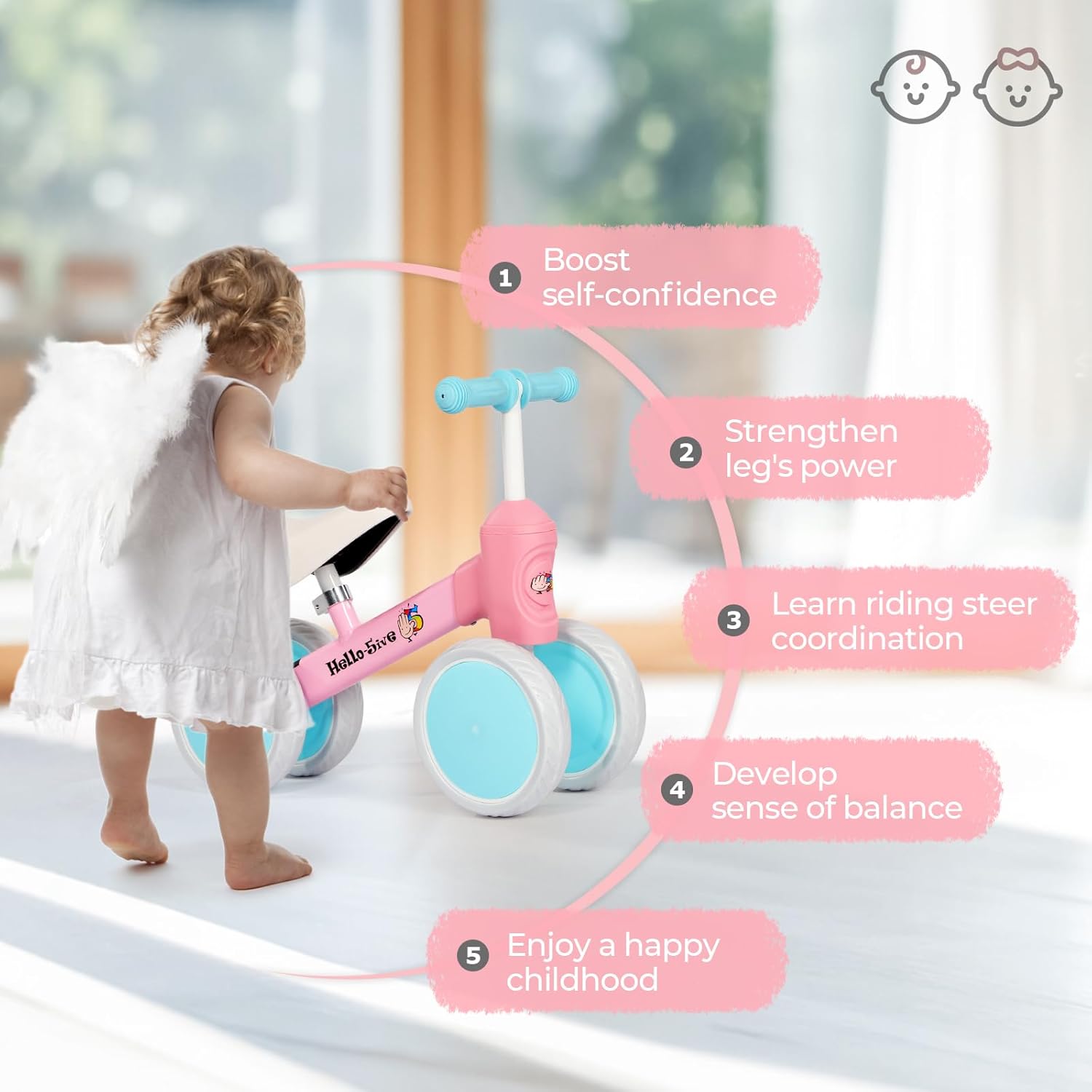 - Convient aux enfants de 1 à 3 ans : idéal pour développer l’équilibre, la coordination et la confiance en soi.