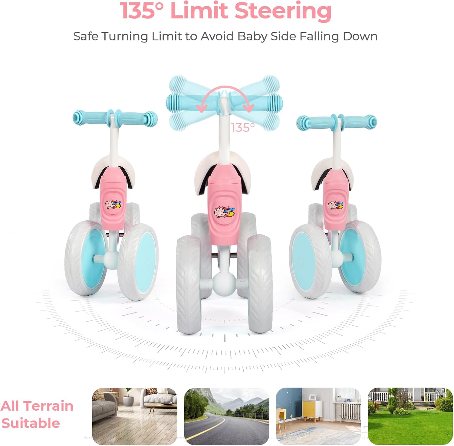 Les poignées en caoutchouc antidérapantes offrent une prise en main stable et confortable, permettant à votre enfant de diriger facilement son vélo. Les roues élargies assurent une stabilité accrue et permettent une utilisation fluide sur différents types de surfaces, qu’il s’agisse de parquet, de carrelage ou même de terrains extérieurs comme l’herbe ou le gravier. Votre bébé pourra ainsi explorer son environnement en toute liberté.